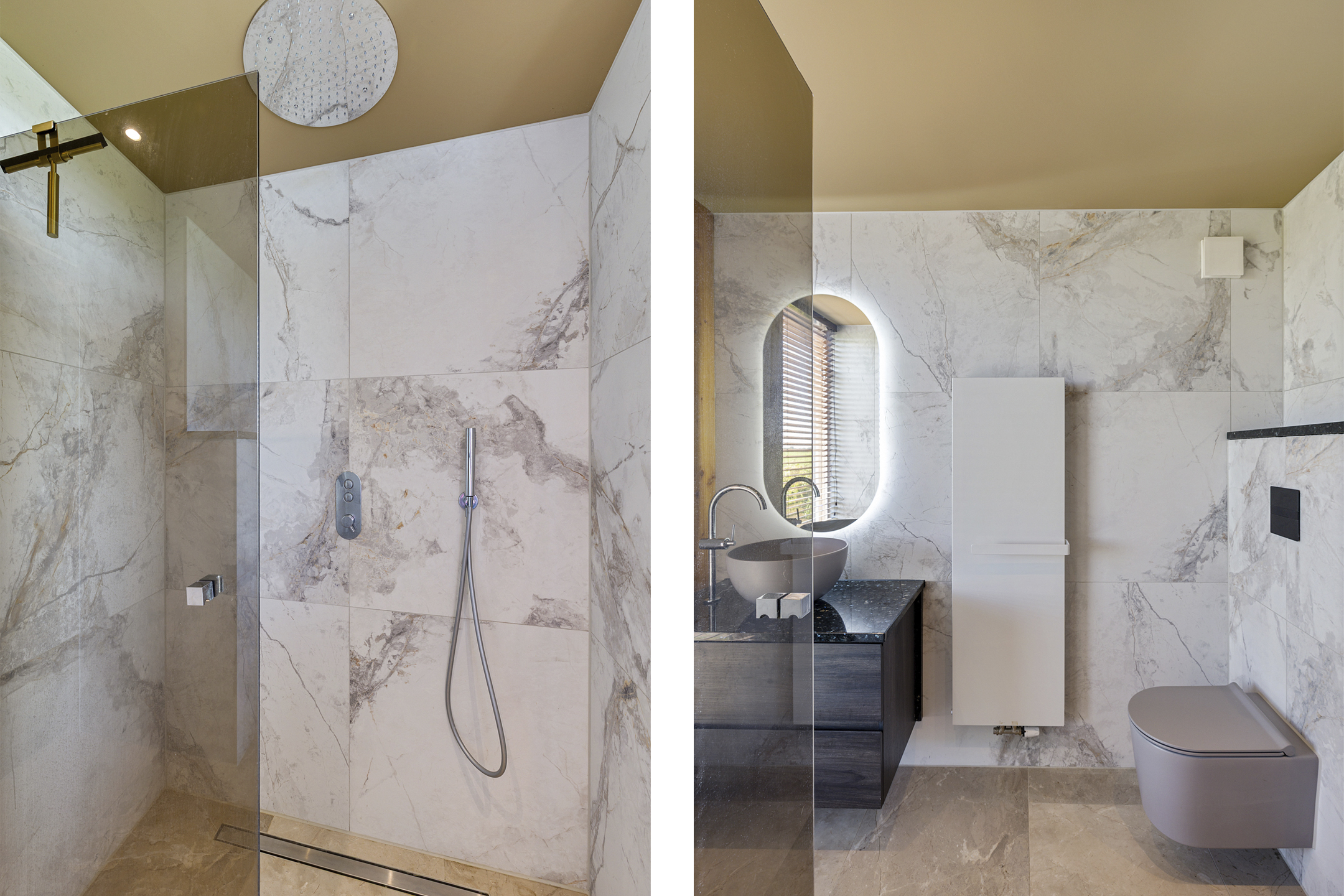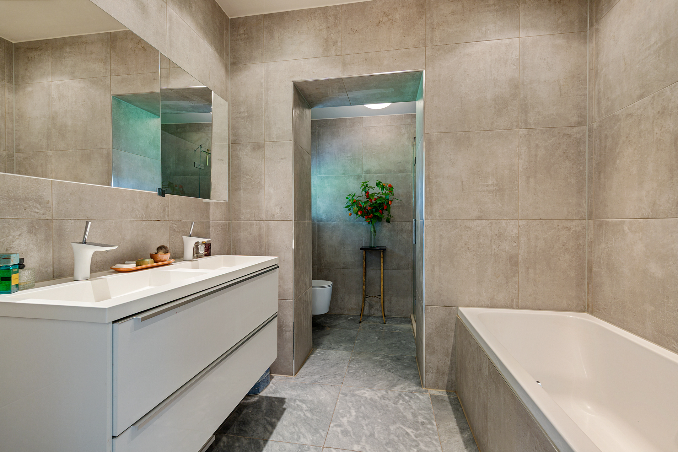 De luxe vloer met keramische tegels is voorzien van vloerverwarming, en de verlichting is domotica gestuurd.