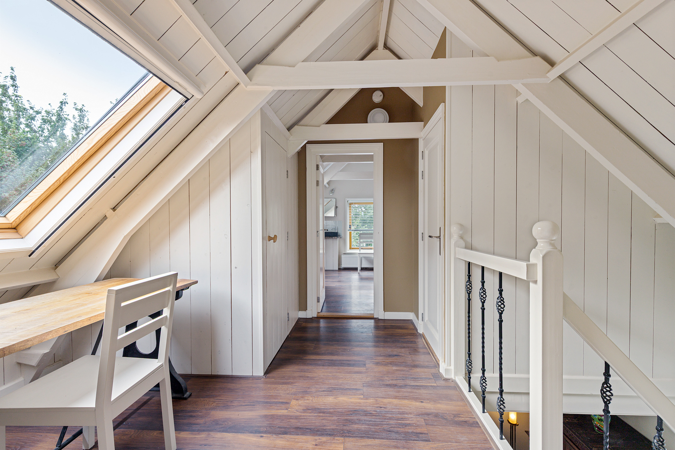 De badkamer en witgoedruimte zijn afgesloten ruimtes onder de rechter loft.