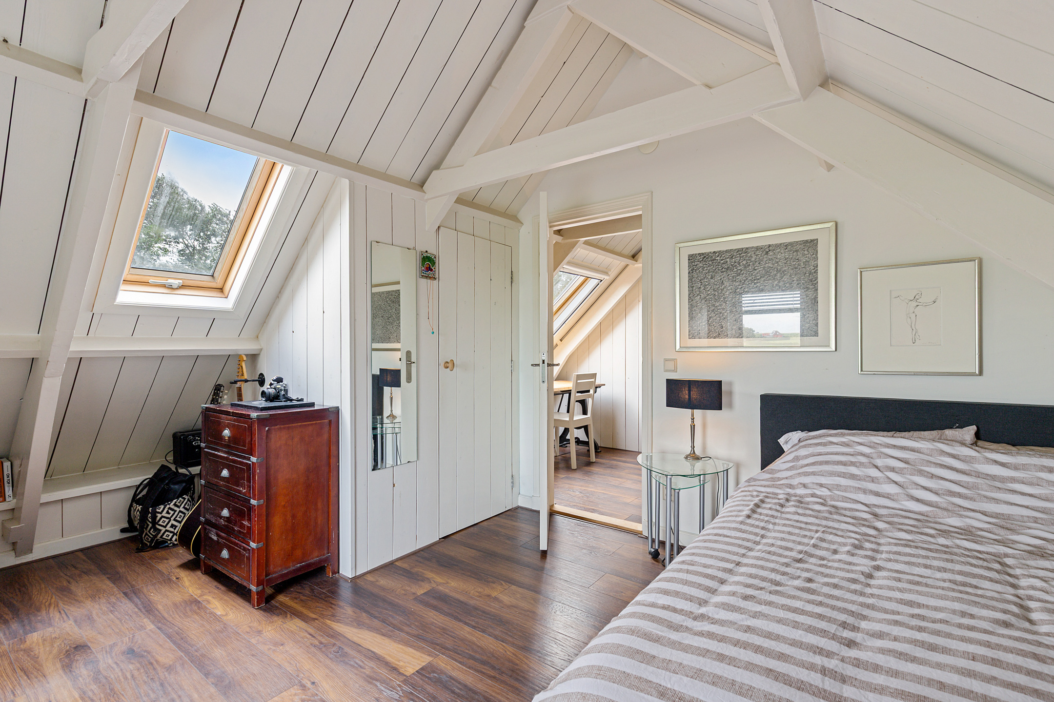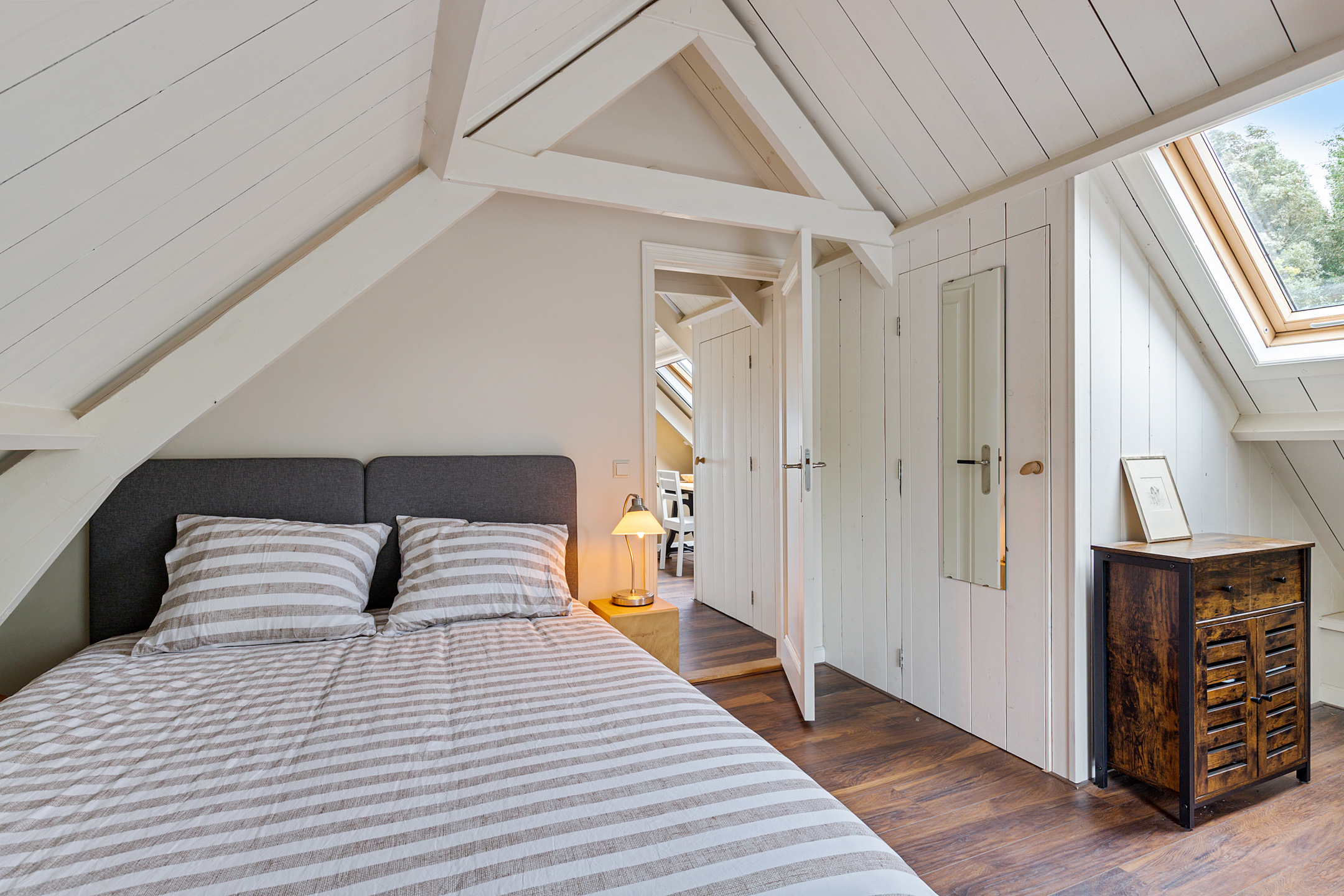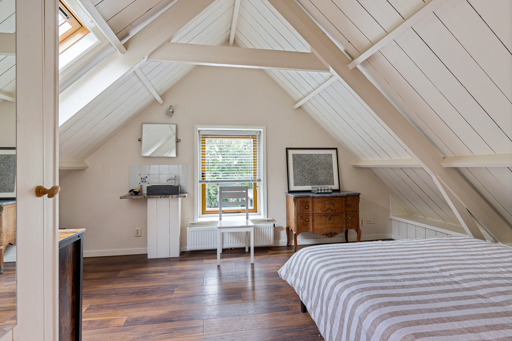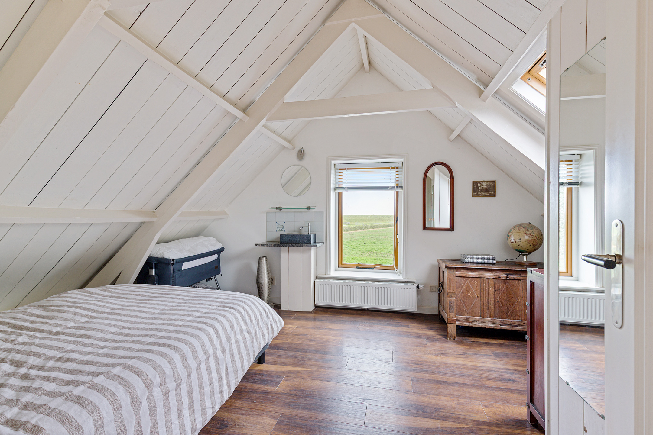 De sfeer van de oude dijkwoning blijft voelbaar. Twee knusse, stijlvolle slaapkamers, overloop met royale inbouwkasten onder het zadeldak, dakbeschot en gebinten in het zicht. Beide slaapkamers zijn voorzien van een wastafelmeubel.