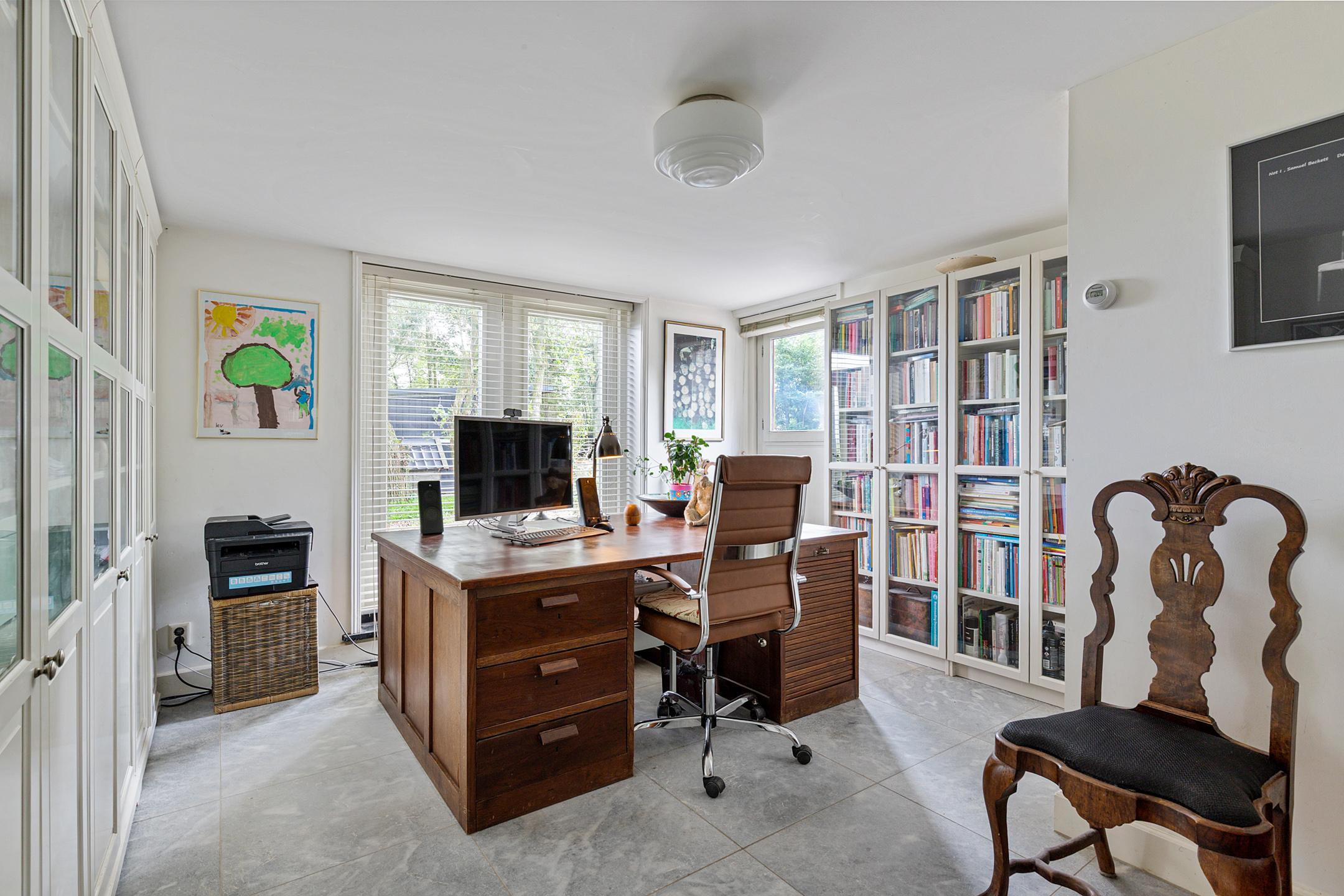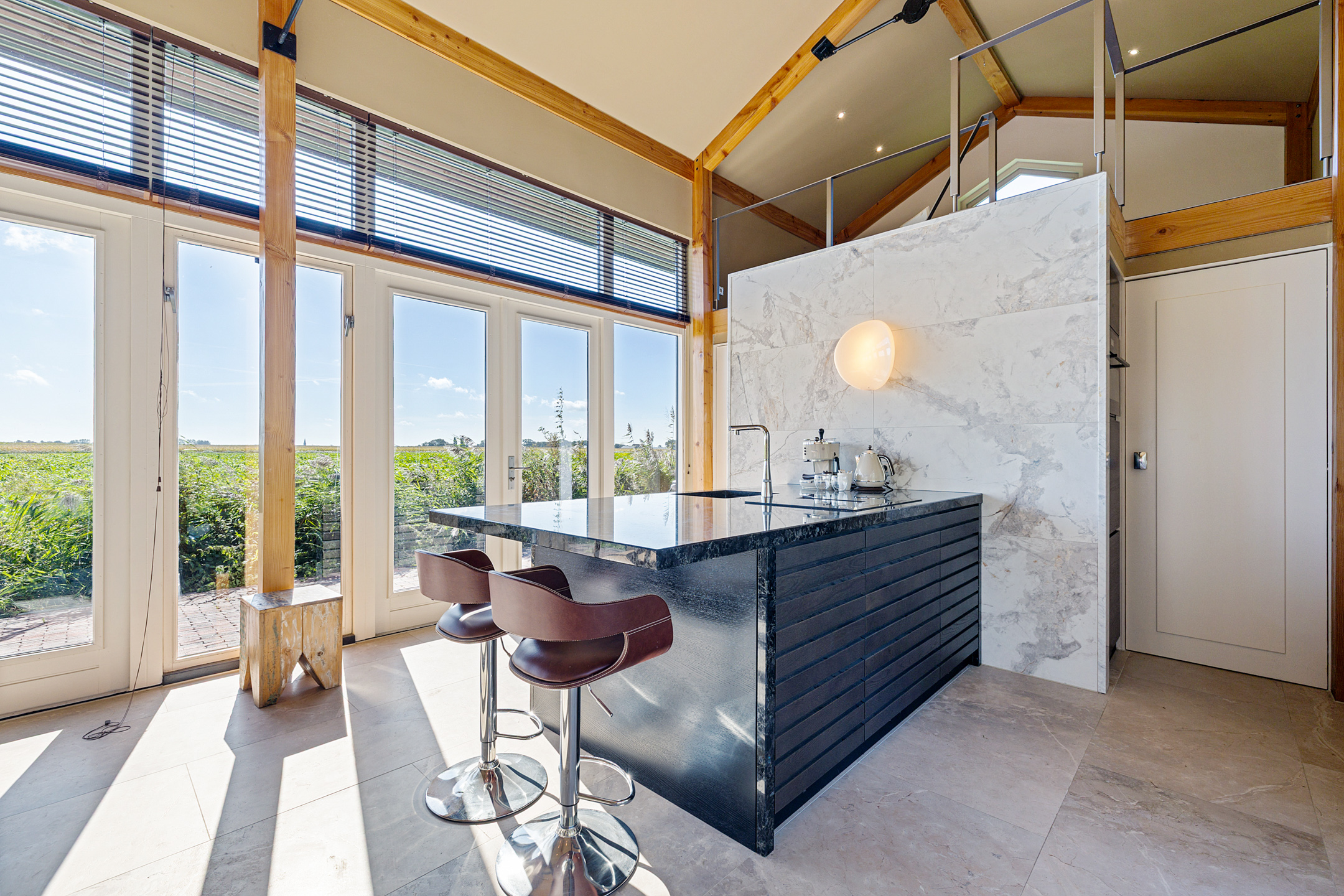 De lichte woonkeuken in de linker vleugel biedt panoramisch zicht op de Waddendijk en landerijen. Een centrale plek om te koken en te tafelen, voorzien van hoogwaardige inbouwapparatuur. Achter de keuken bevindt zich via een gang met prachtige Friese tegelwand de huidige studeerkamer, met deuren naar tuin en badkamer/toilet. Boven de studeerkamer ligt een lichte loft, geschikt als logeerkamer of atelier.