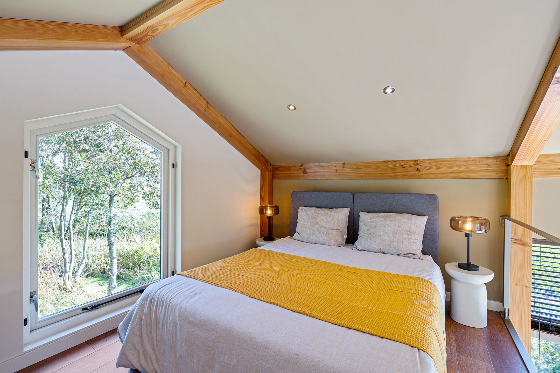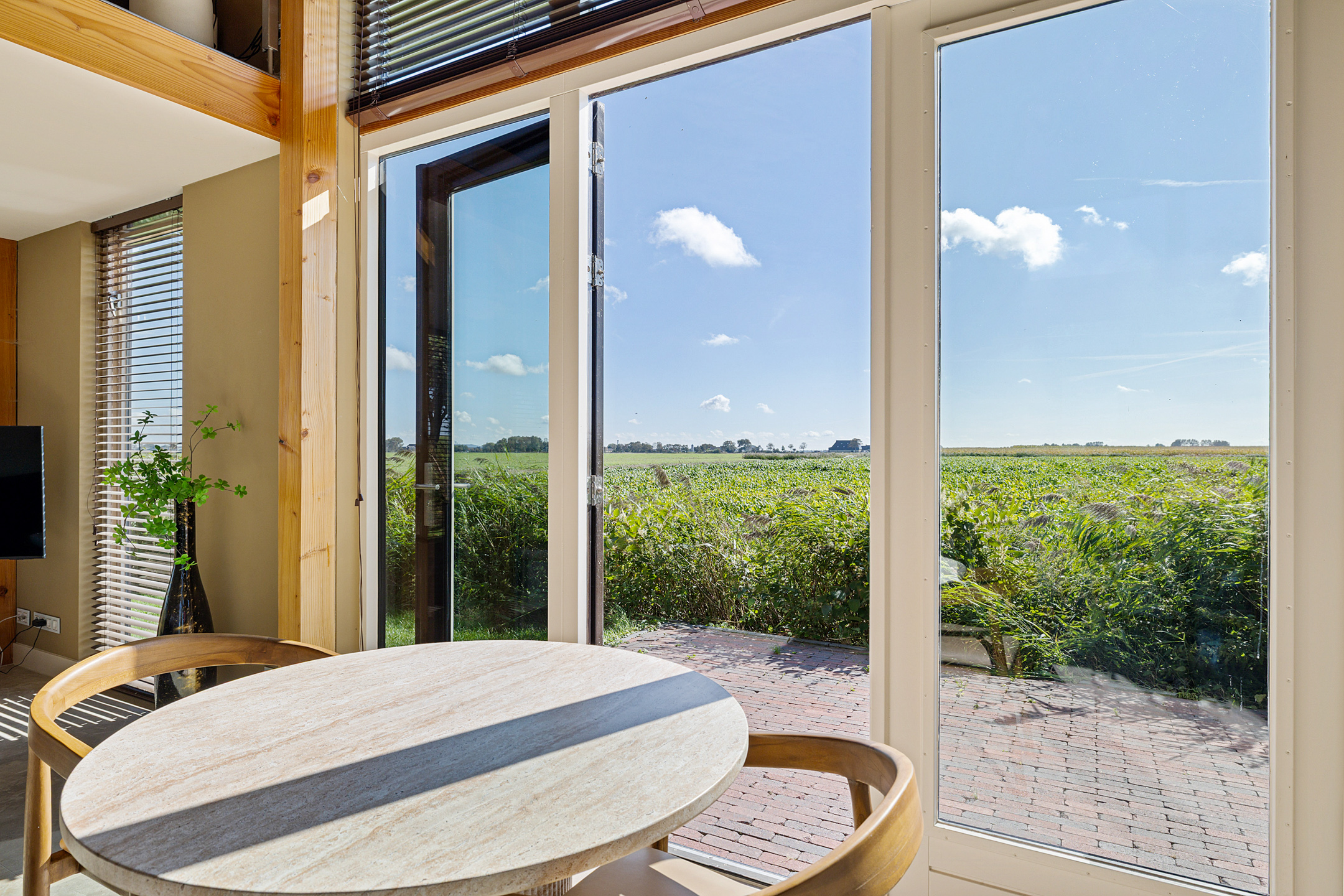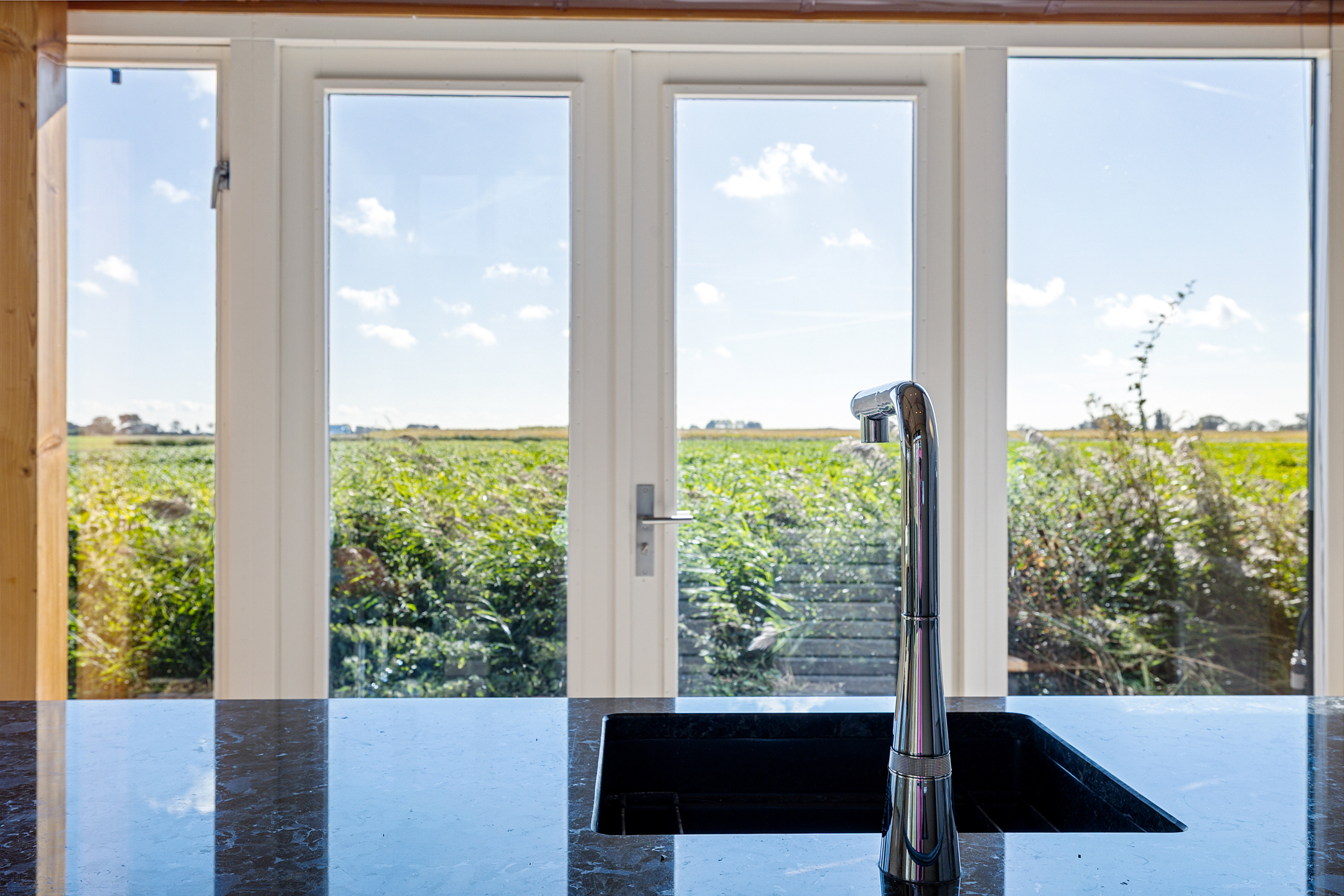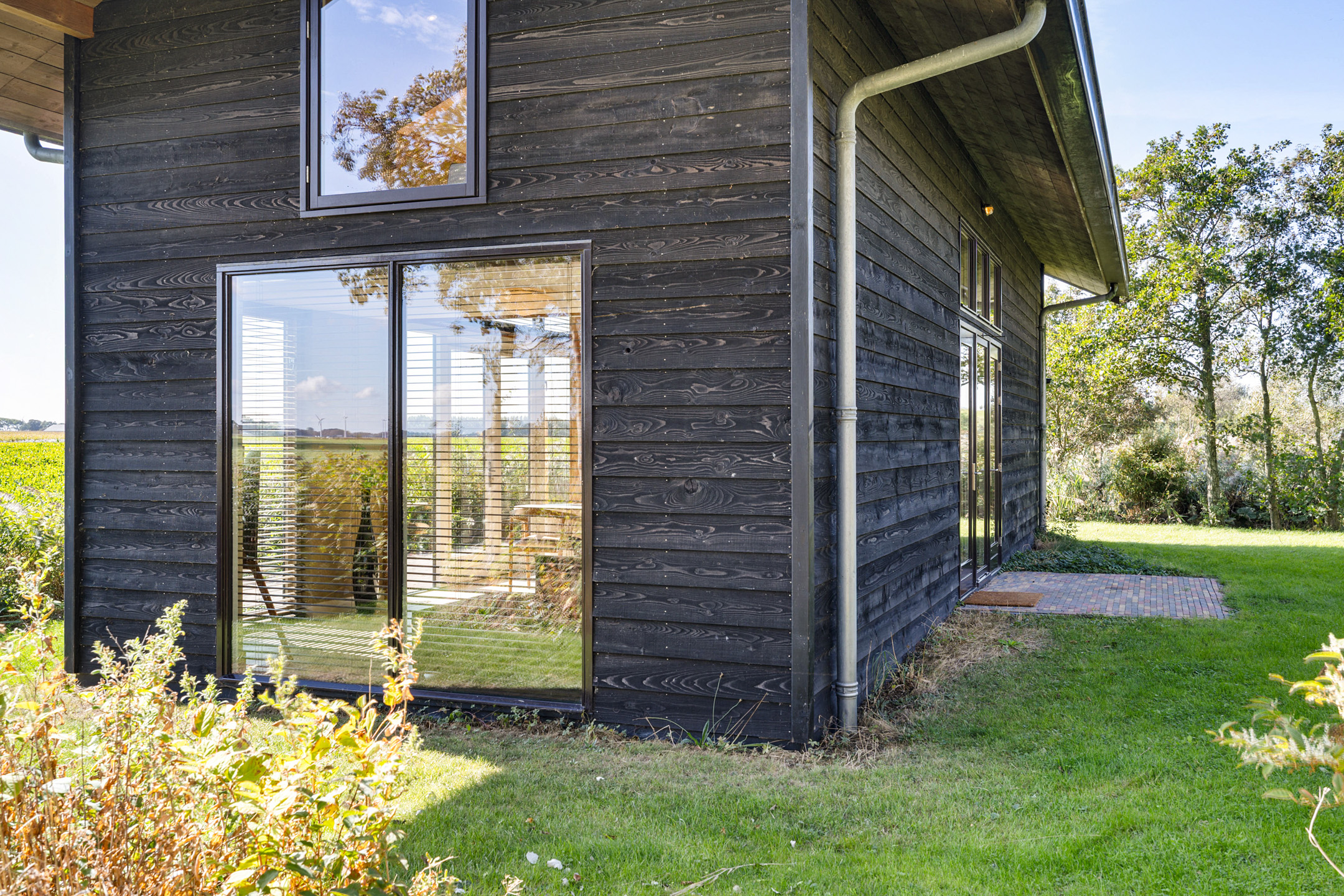 Het bijhuis, type schuurwoning (ca 13x4.5m) is onder architectuur gebouwd, volledig geïsoleerd en rondom voorzien van hoge raampartijen (HR++) met panoramisch zicht. De huisje is aan de lange zijde zowel aan de voorkant als aan de achterkant middels openslaande tuindeuren te betreden. Met aan beide zijden terrassen met handgevormde klinkers. De lichte hoge ruimte met stoere douglas spanten in het zicht benadrukken het leven in en met de natuur. Dankzij het dark-sky gebied is de prachtige sterrenhemel helder in volle glorie te zien. Zelfs het Noorderlicht vertoont zich hier geregeld. En wat van de overvliegende zwermen water-, trek- en weidevogels..