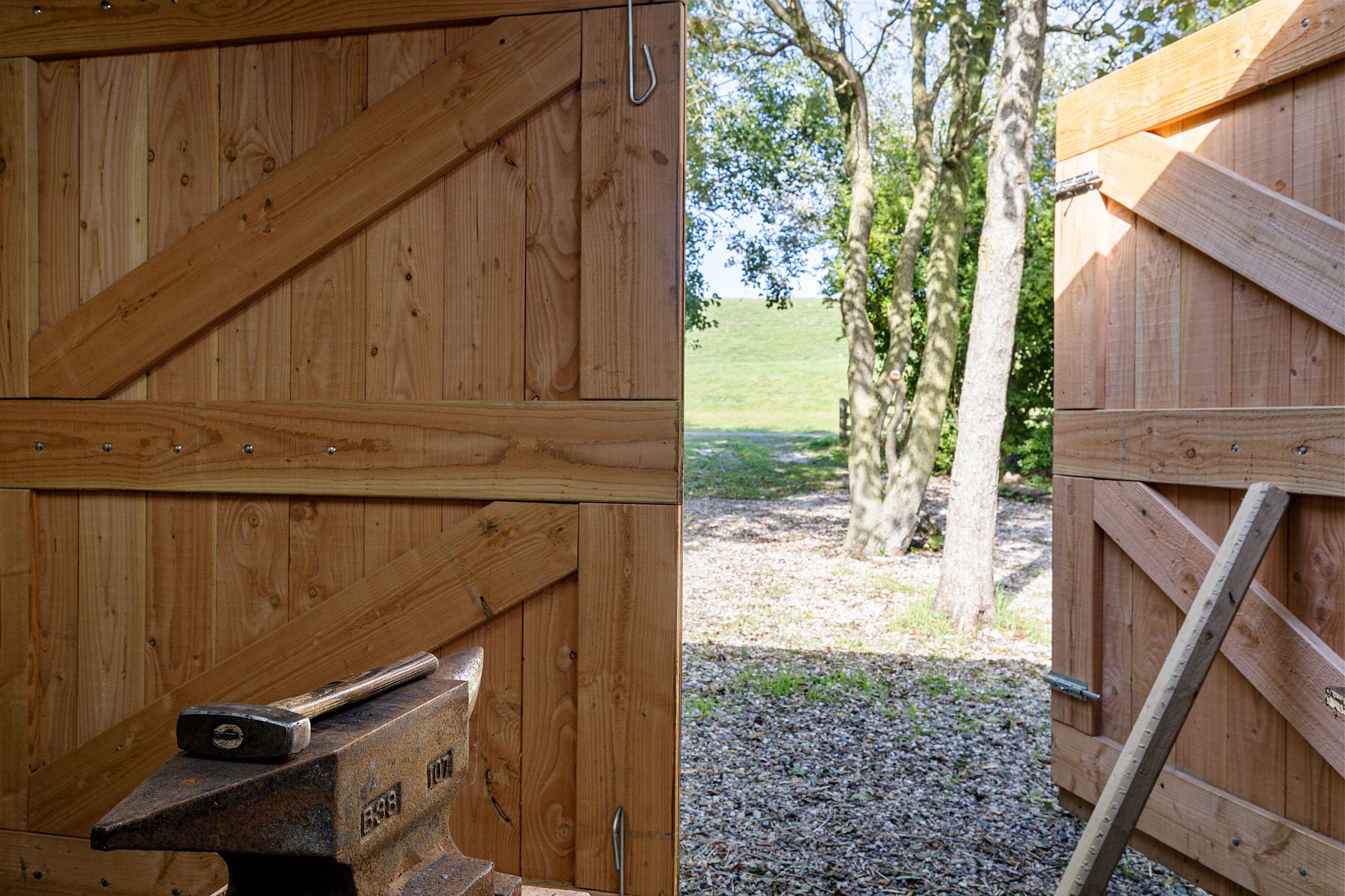 • Schuur, garage-werkplaats met overkapping en houtopslag