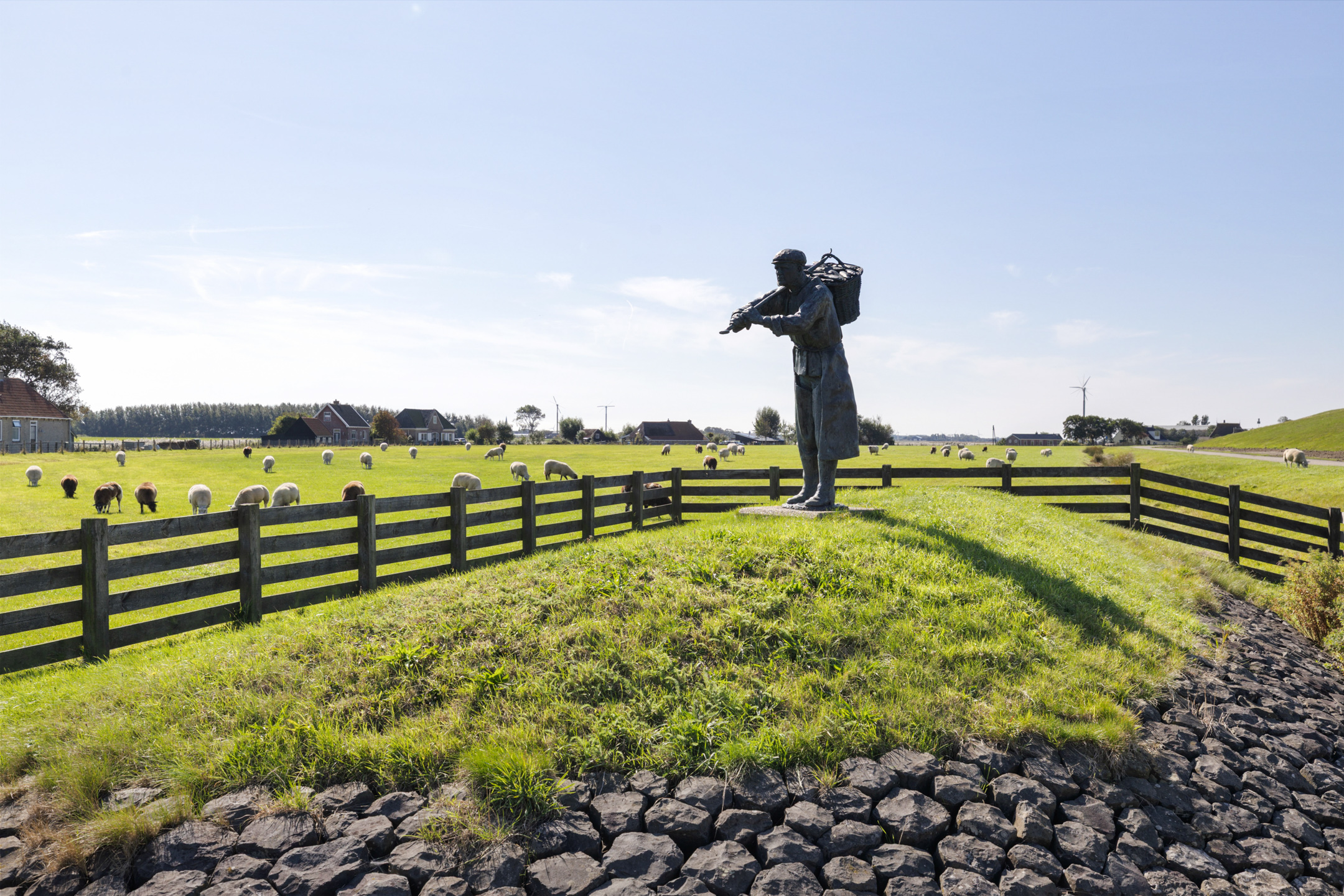 • Panoramisch uitzicht over Waddendijk, Waddenzee, vijver en landerijen
