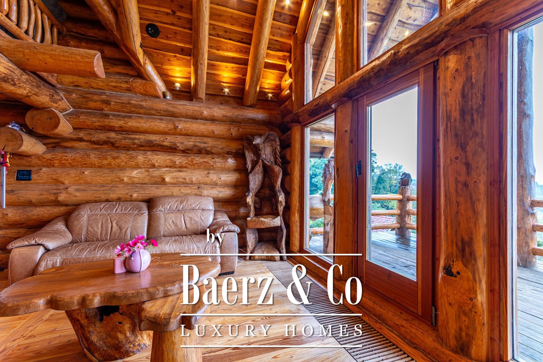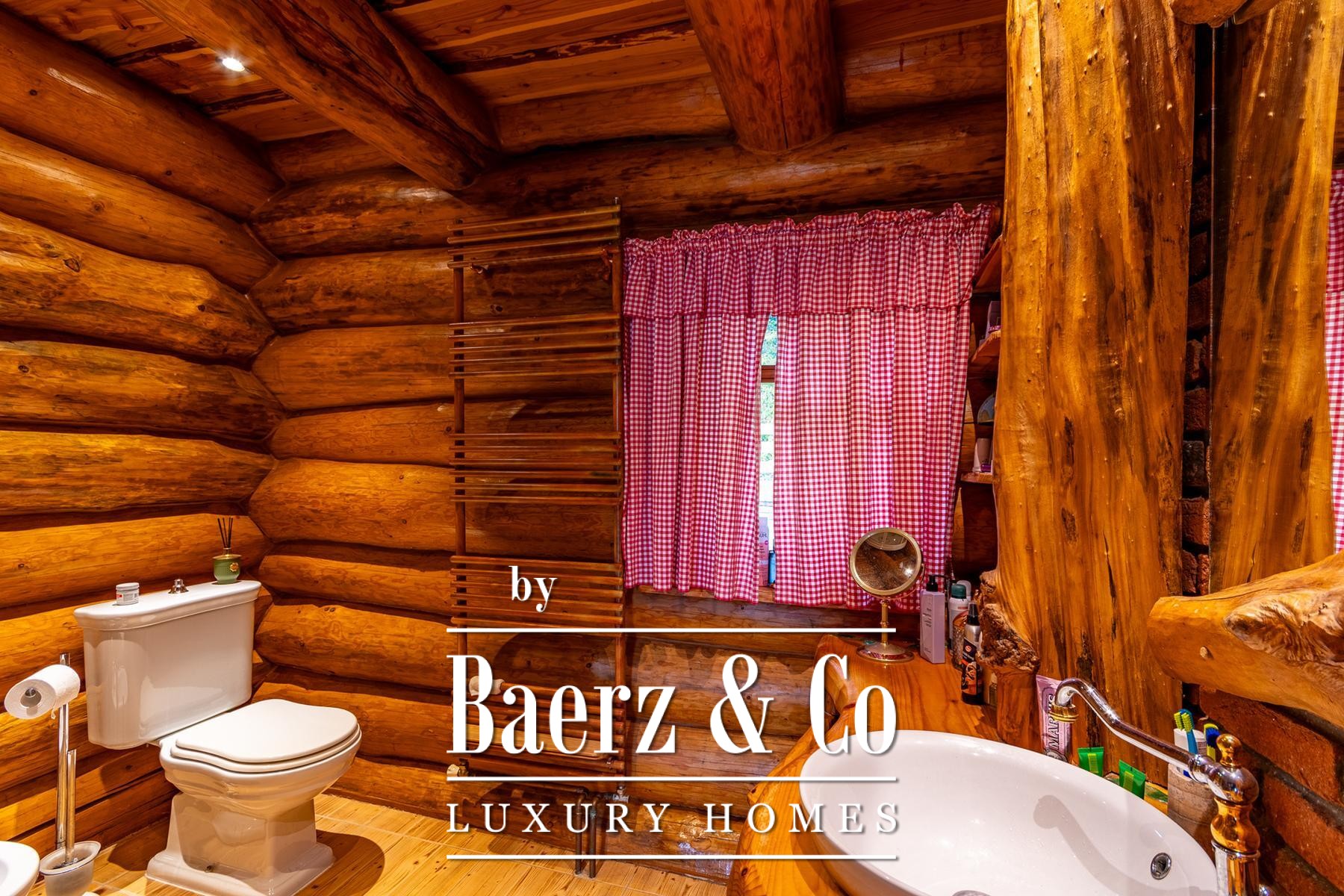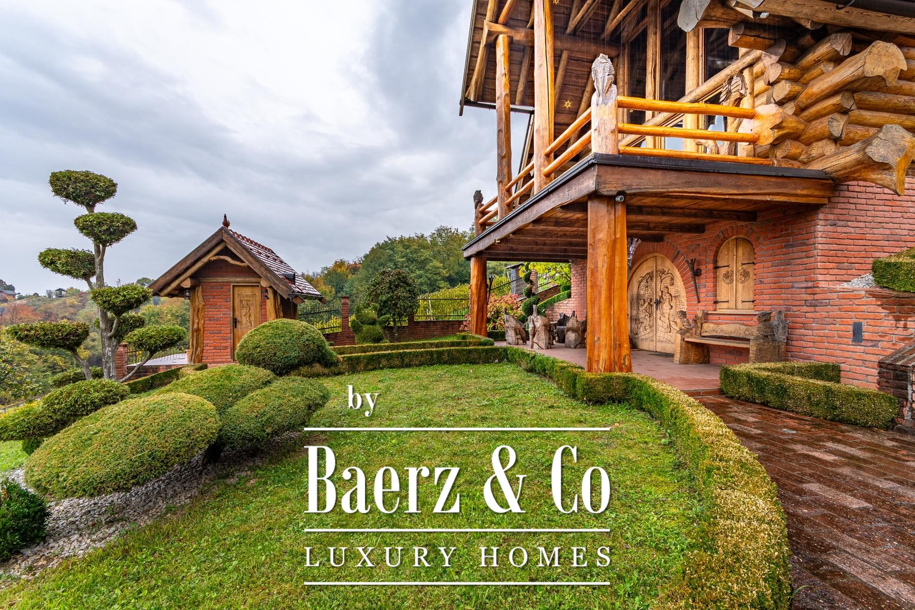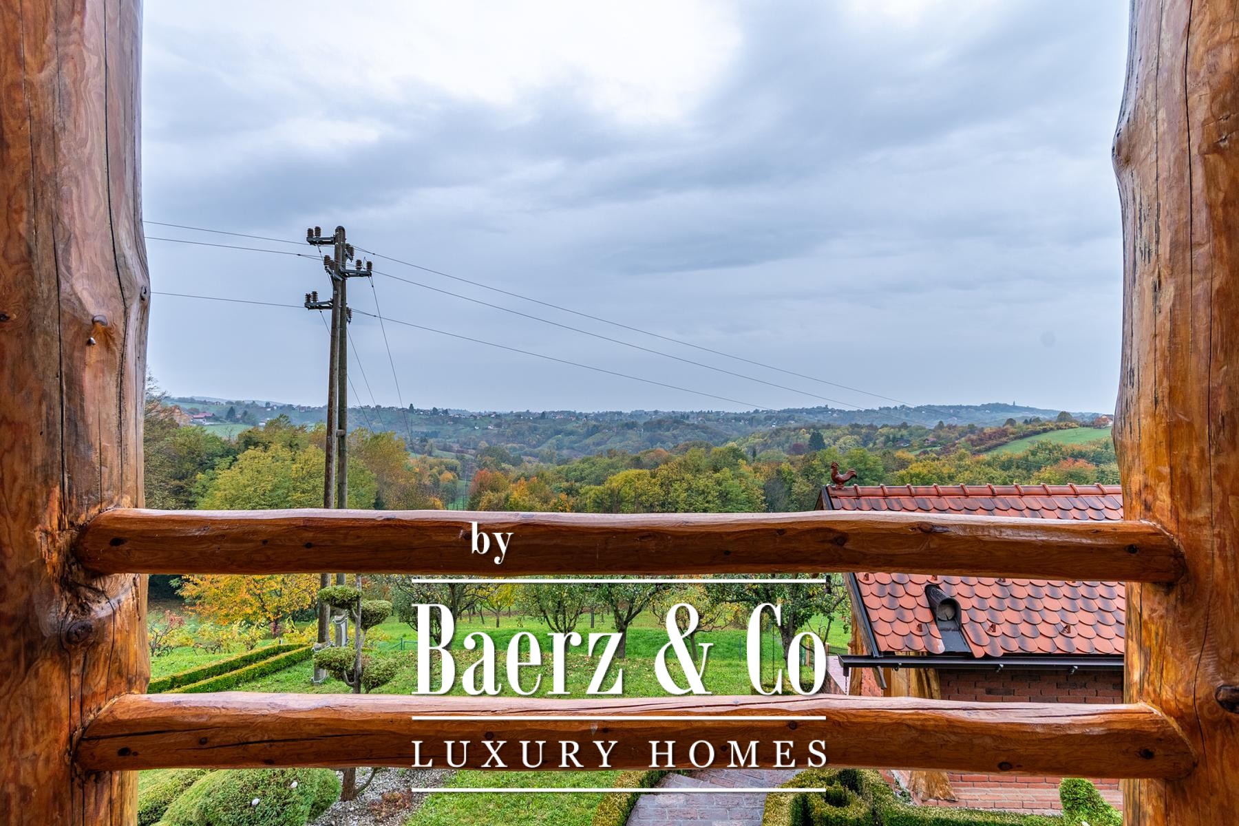 Drie bijgebouwen—een paviljoen, werkplaats en een buitentoilet—onderstrepen het authentieke landelijke karakter. Het zorgvuldig aangelegde perceel met appel-, pruimen-, vijgen-, aronia- en frambozenbomen biedt ruimte voor bezinning en rust. Panoramische vergezichten en diepe privacy creëren een unieke sfeer. Dit is niet eenvoudigweg een blokhut te koop in Varaždinske Toplice, maar een weloverwogen toevluchtsoord geworteld in locatie en materiaal.