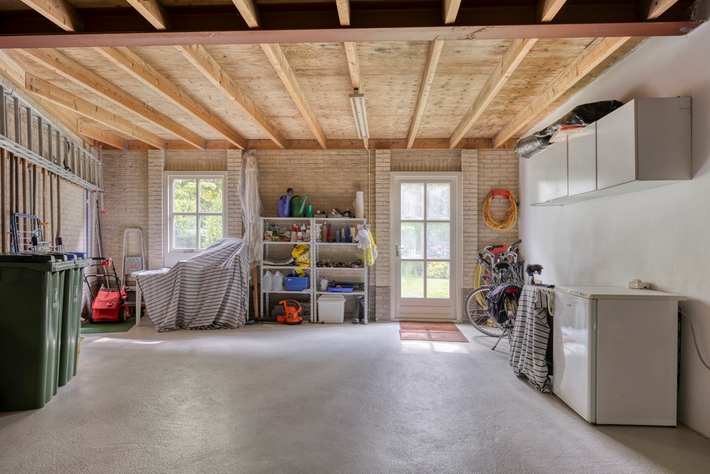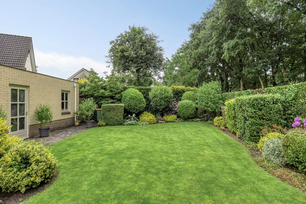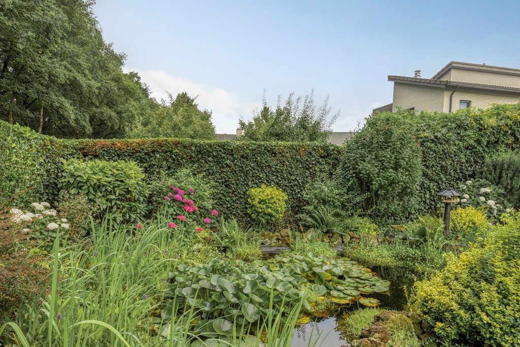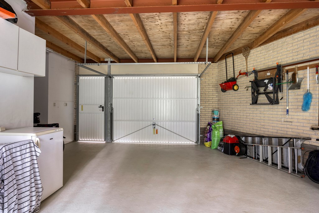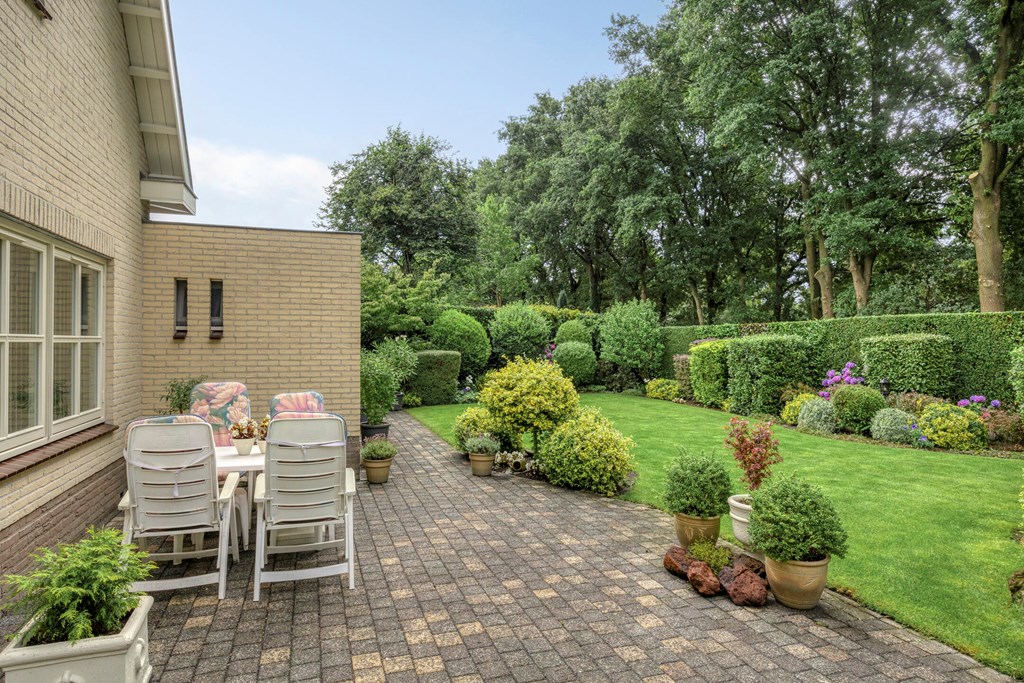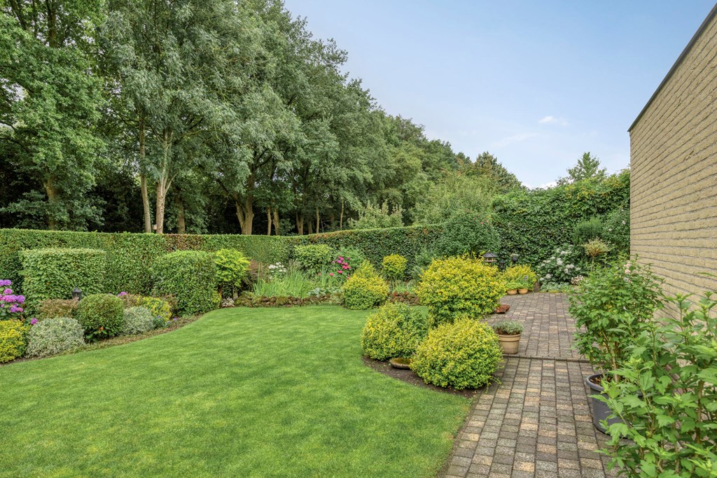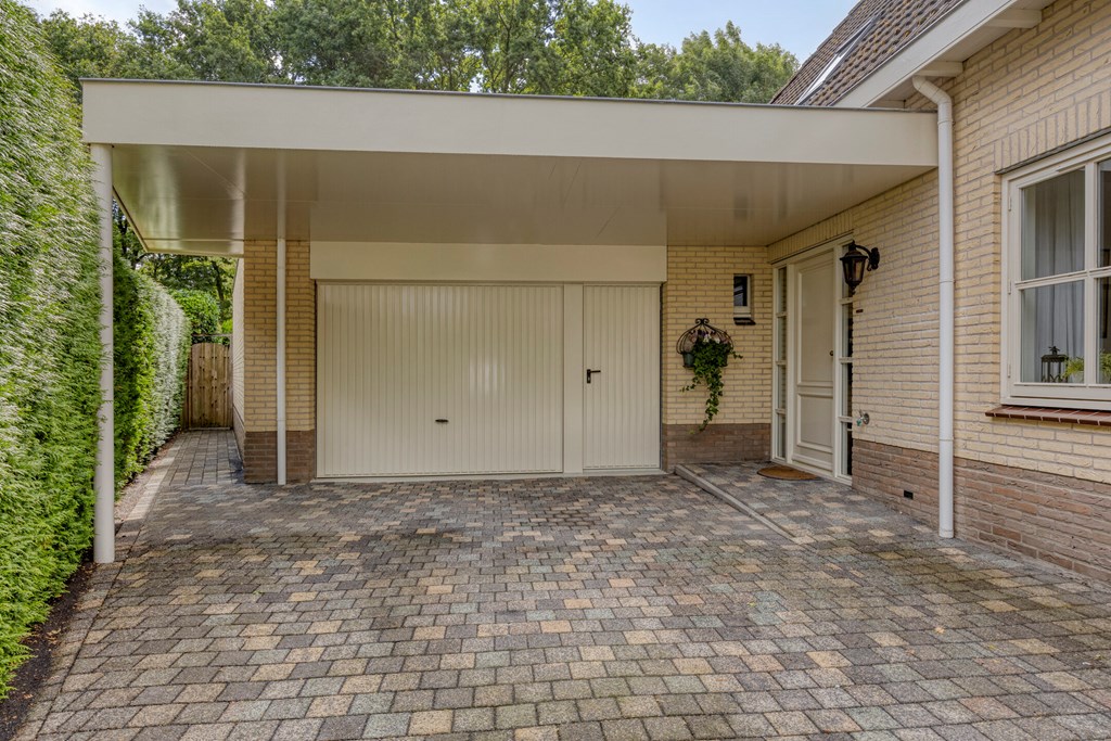 De tuin rondom is tot in de puntjes verzorgd. Aan de voorzijde biedt de brede oprit plaats aan meerdere auto’s, onder de carport staat uw auto beschut. Vanaf hier heeft u bovendien direct toegang tot de garage, met overhead- en loopdeur – een bijzonder ruime en multifunctionele ruimte van maar liefst 57 m². Ideaal voor dagelijks gebruik, voor het veilig stallen van fietsen, het uitvoeren van klusprojecten of het inrichten van een royale werk- of hobbyruimte met eigen entree. De achtertuin is een lust voor het oog: een groot zonneterras met sierbestrating, strak gazon, een vijver en borders vol kleur en variatie. Dankzij de volgroeide hagen, bomen en de achterliggende bosschage geniet u hier in alle rust en privacy. Of u nu buiten wilt ontbijten, een boek leest onder de boom of gasten ontvangt tijdens een zomeravond – het kan hier allemaal. En met directe toegang vanuit de woonkamer, bijkeuken én garage is deze tuin ook nog eens bijzonder praktisch ingedeeld.