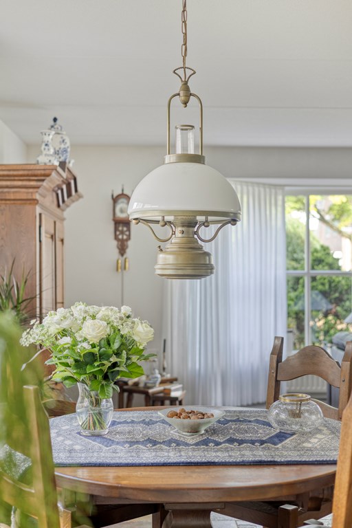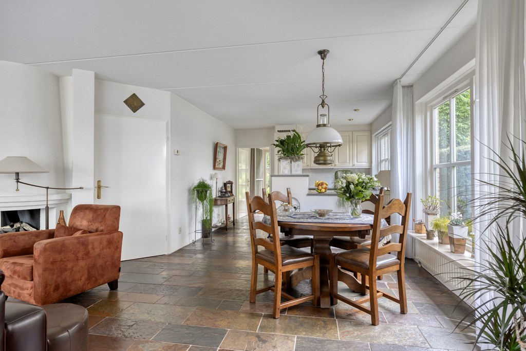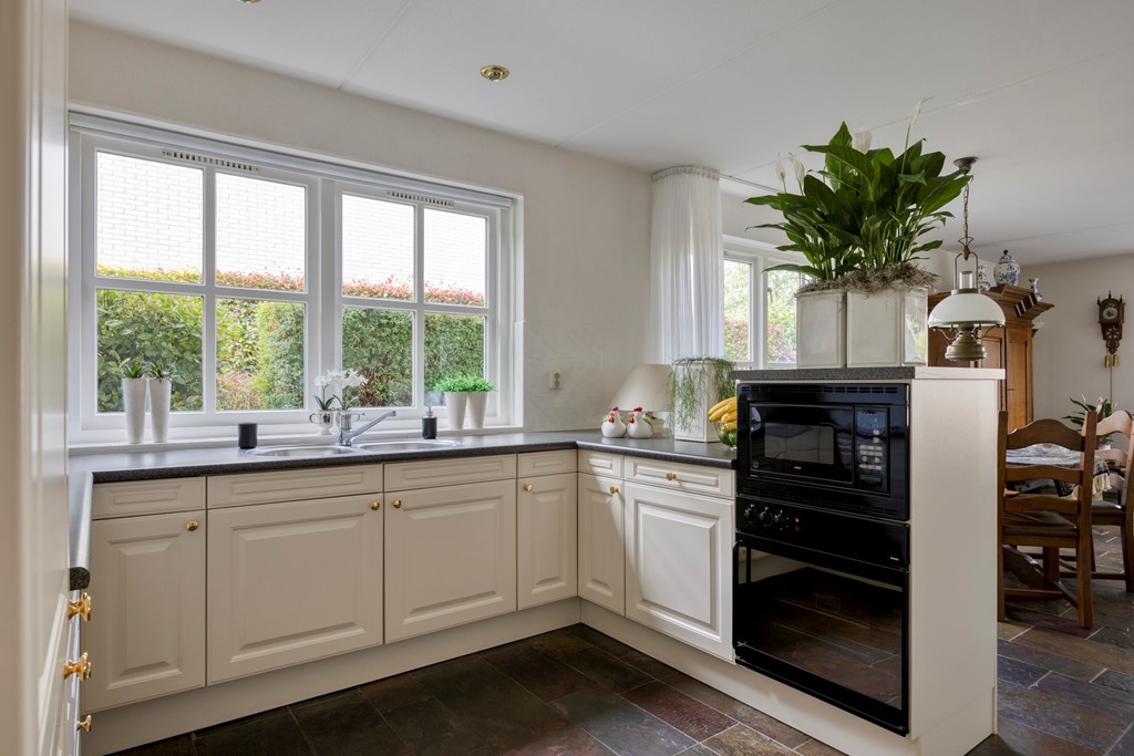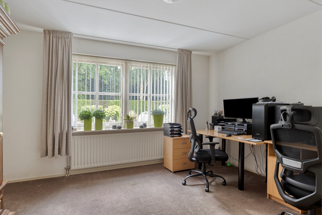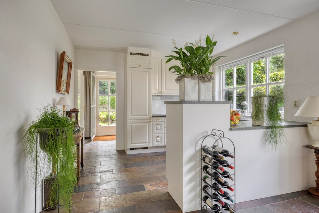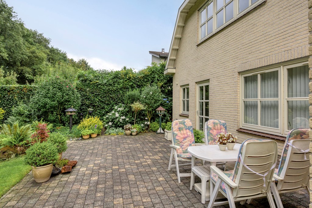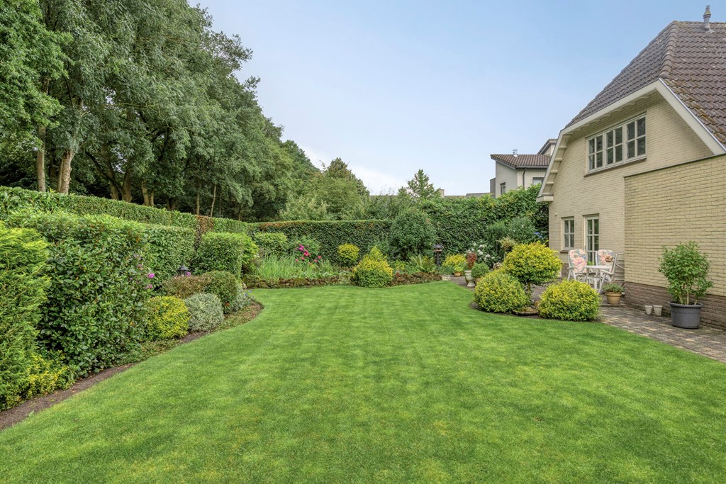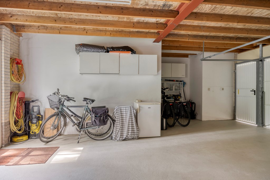 De tuin rondom is tot in de puntjes verzorgd. Aan de voorzijde biedt de brede oprit plaats aan meerdere auto’s, onder de carport staat uw auto beschut. Vanaf hier heeft u bovendien direct toegang tot de garage, met overhead- en loopdeur – een bijzonder ruime en multifunctionele ruimte van maar liefst 57 m². Ideaal voor dagelijks gebruik, voor het veilig stallen van fietsen, het uitvoeren van klusprojecten of het inrichten van een royale werk- of hobbyruimte met eigen entree. De achtertuin is een lust voor het oog: een groot zonneterras met sierbestrating, strak gazon, een vijver en borders vol kleur en variatie. Dankzij de volgroeide hagen, bomen en de achterliggende bosschage geniet u hier in alle rust en privacy. Of u nu buiten wilt ontbijten, een boek leest onder de boom of gasten ontvangt tijdens een zomeravond – het kan hier allemaal. En met directe toegang vanuit de woonkamer, bijkeuken én garage is deze tuin ook nog eens bijzonder praktisch ingedeeld.
