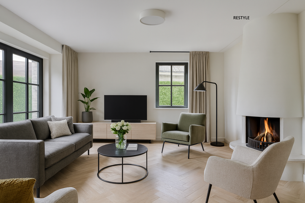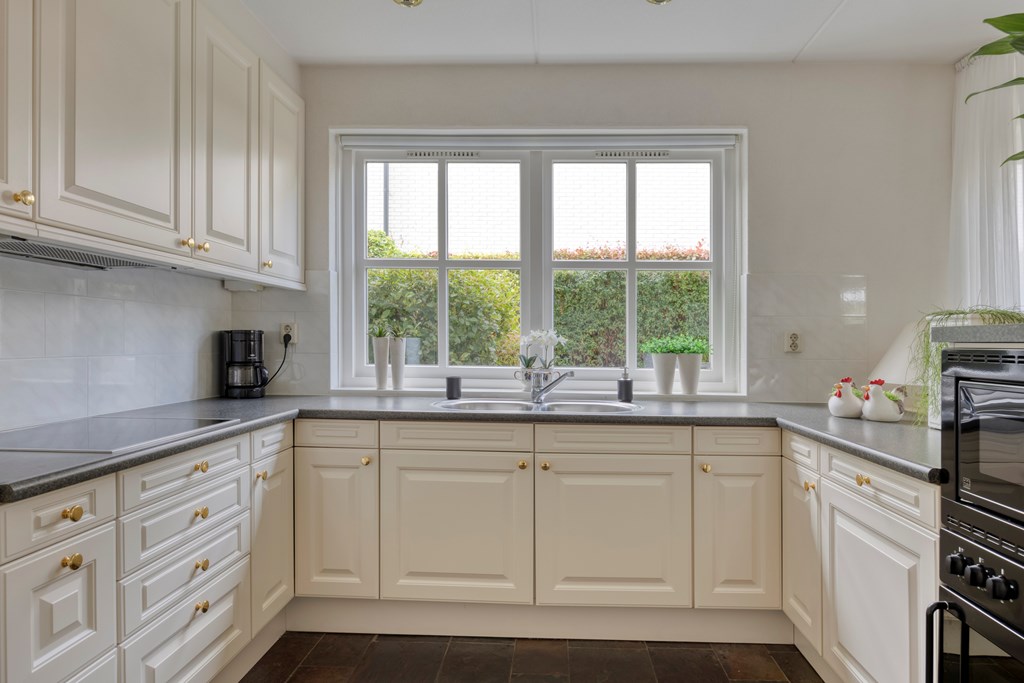 De sfeervolle woonkamer is opvallend licht dankzij de grote erker aan de voorzijde en het brede raam aan de zijkant. De zithoek rondom de open haard vormt een gezellige plek voor lange avonden met familie of vrienden. Richting de achterzijde is ruimte voor een royale eethoek bij de open keuken. De keuken is een U-opstelling met schiereiland, voorzien van crèmekleurige fronten, donker werkblad en complete inbouwapparatuur: een inductiekookplaat, vlakscherm afzuigkap, combimagnetron, oven, koel-/vriescombinatie en een vaatwasser. Aansluitend ligt de praktische bijkeuken met witgoedaansluitingen, opbergruimte en een buitendeur naar het terras. Tot slot bevindt zich op de begane grond een extra kamer – ideaal als thuiskantoor, hobbyruimte, speelkamer of slaapkamer. Via deze kamer bereikt u binnendoor de badkamer – met douche, toilet en wastafel – handig voor wie levensbestendig wil wonen of gasten ontvangt. Daarnaast zijn de deuren op de begane grond breed waardoor ze ook toegankelijk zijn voor een rolstoel.