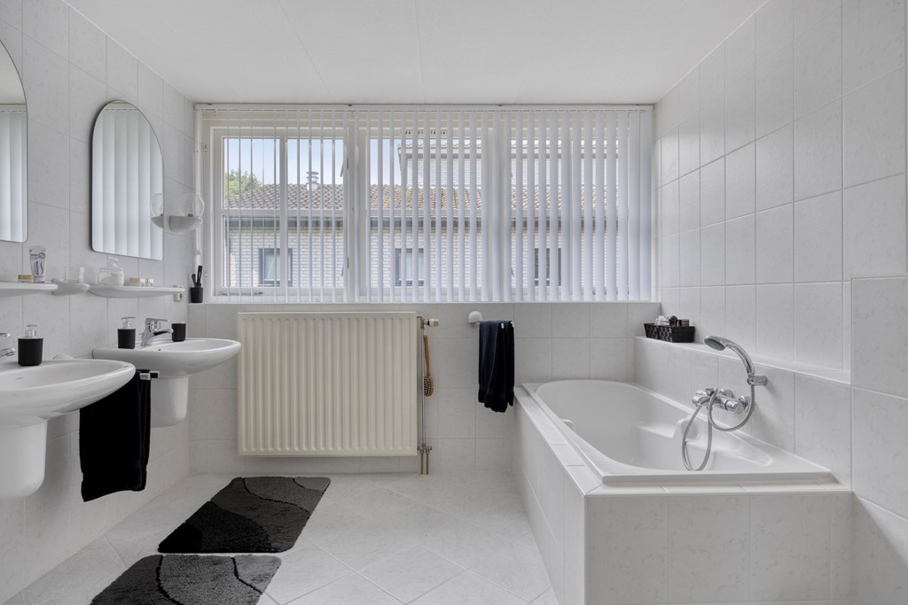 De overloop op de eerste verdieping is verrassend ruim en biedt toegang tot twee comfortabele slaapkamers. De slaapkamer aan de voorzijde is extra royaal met uitzicht op de rustige straat. Deze kan ook gesplitst worden, zodat er een extra kamer gecreëerd wordt. Aan de achterzijde ligt nog een volwaardige slaapkamer, voorzien van een inbouwwandkast. De badkamer is fris en functioneel ingericht met een ligbad, separate douche, dubbele wastafel, tweede toilet en een groot raam dat zorgt voor veel daglicht.