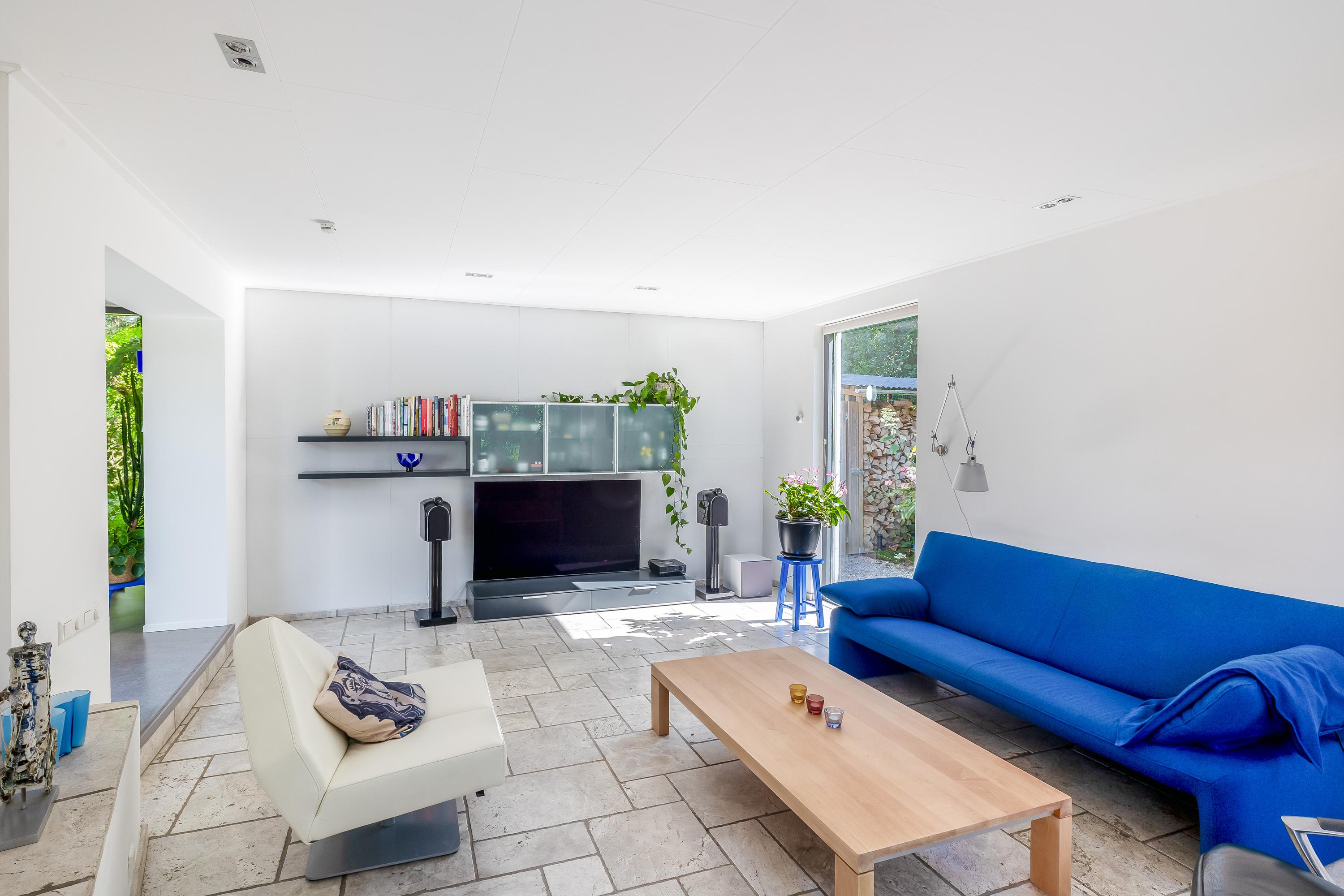 De open doorloop vanuit de entreehal leidt je naar de lichte en ruime woonkamer. Deze is afgewerkt met strak stucwerk op de wanden en de grote raampartijen tot vloerniveau bieden zicht op de patiotuin . Vloeren zijn uitgevoerd met vloerverwarming alsmede de mogelijkheid tot verkoeling, wat zorgt voor een aangenaam klimaat in elk seizoen. Een blikvanger in de woonkamer is de open trapopgang van esdoornhout en staal naar de verdieping.