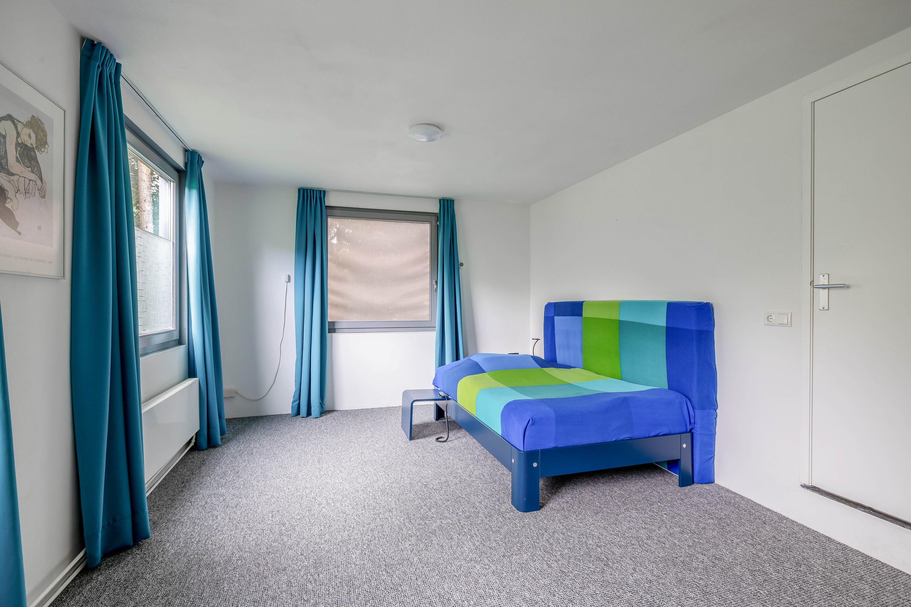 De ruime slaapkamer 1 is afgewerkt met stucwerkwanden en -plafond en vloerbedekking. Dankzij de draai-kiepramen stroomt het natuurlijke licht hier rijkelijk naar binnen; sommige ramen zijn voorzien van een hor en/of