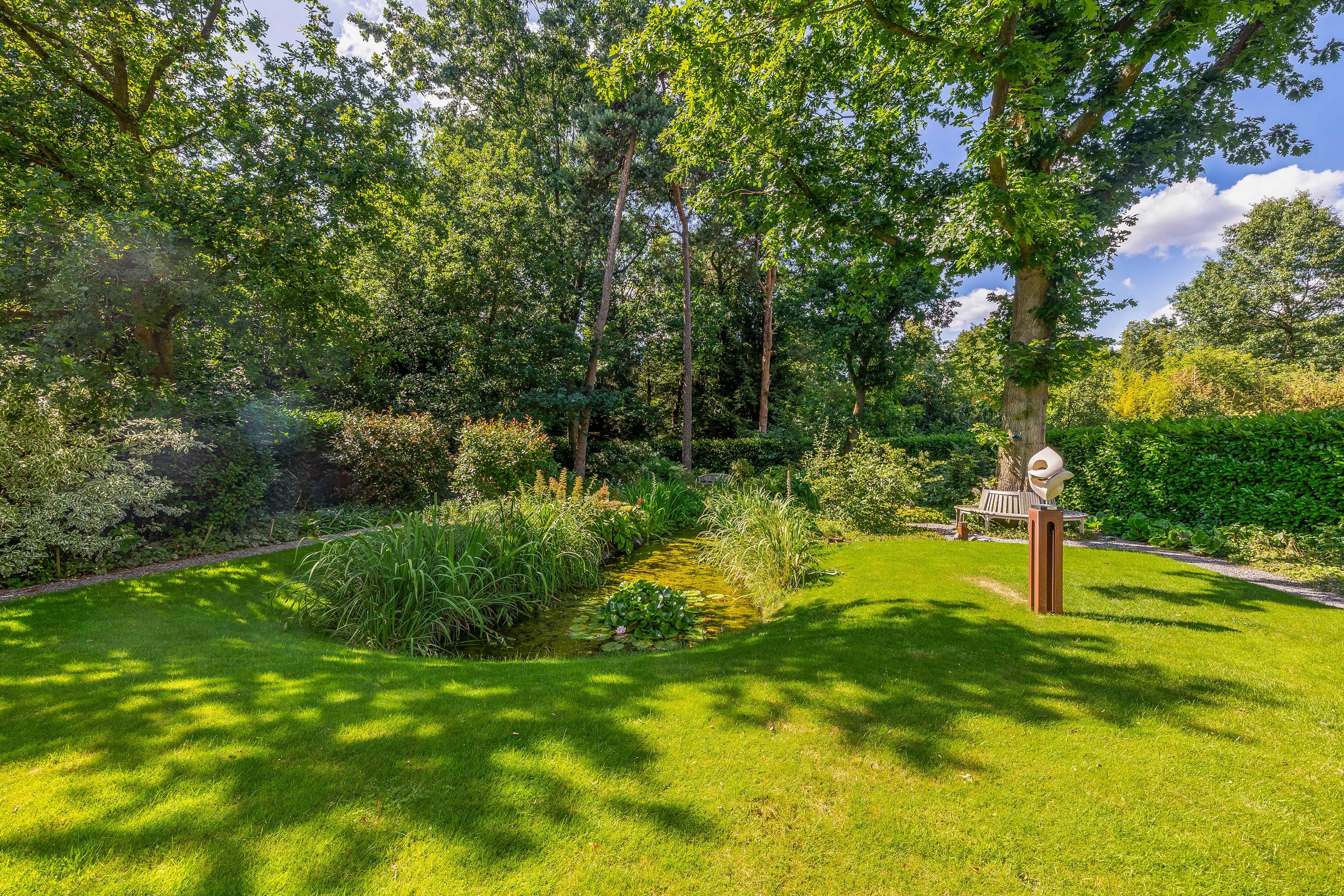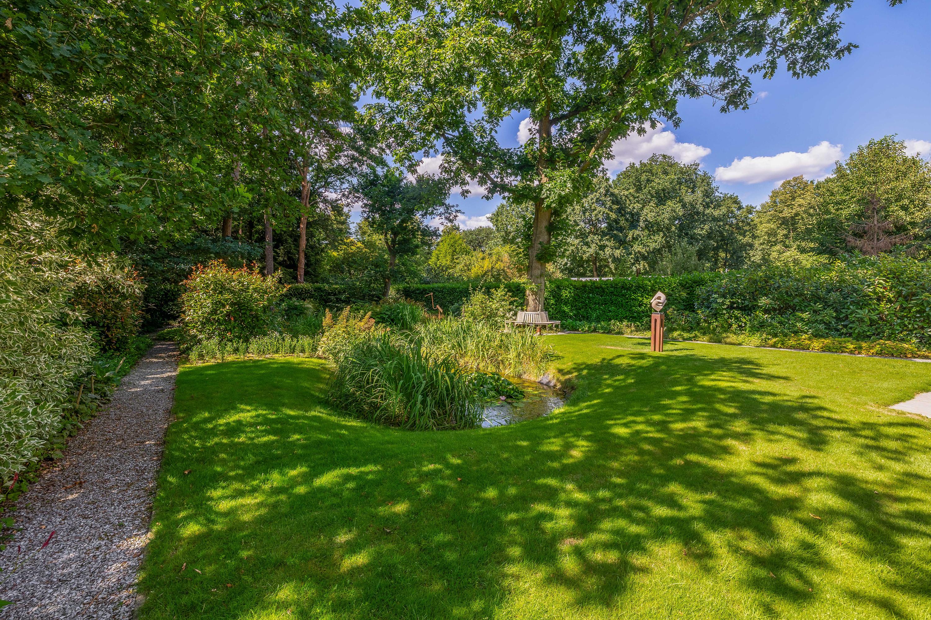 De achtertuin is een ware oase van privacy en rust. Je waant je hier letterlijk in een park omringd door volwassen groen en midden in de natuur. De tuin is rondom afgeschermd door een laurierhaag.. Hier zijn meerdere stroompunten en buitenkraantjes aanwezig, en voor gezellige avonden is er een buitenhaard te vinden! Het geheel is prachtig aangelegd met groot gazon, beplanting en een fraaie vijver. Natuurlijk mag een computergestuurde beregeningsinstallatie hier niet ontbreken. Een prachtige aangelegde tuin met walnotenboom, magnolia's en ook veel bosvruchten: blauwe bessen (25 kg per jaar), bramen en frambozen.