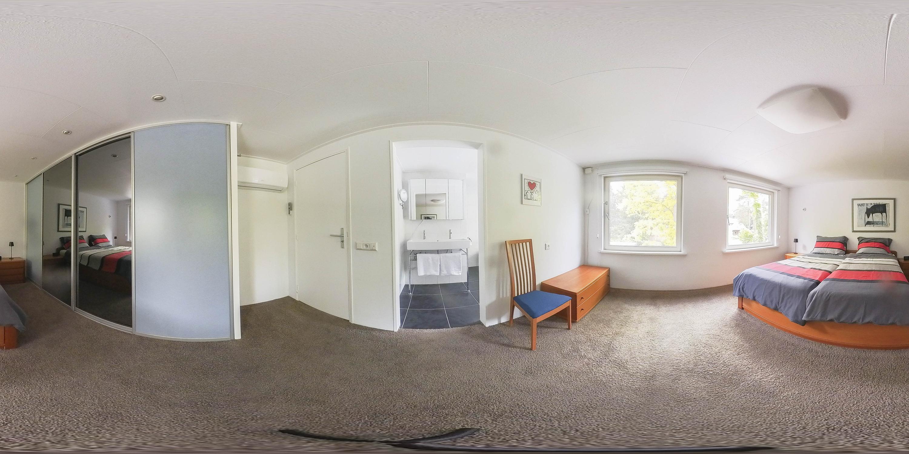 Slaapkamer 2 beschikt over een vaste inbouwkast met vier schuifdeuren en verlichting door inbouwspots. Ook hier draai-kiepramen met rolluiken en een hor. Stucwerkwanden, vloerbedekking en een airco, die voor verwarming en koeling zorgt