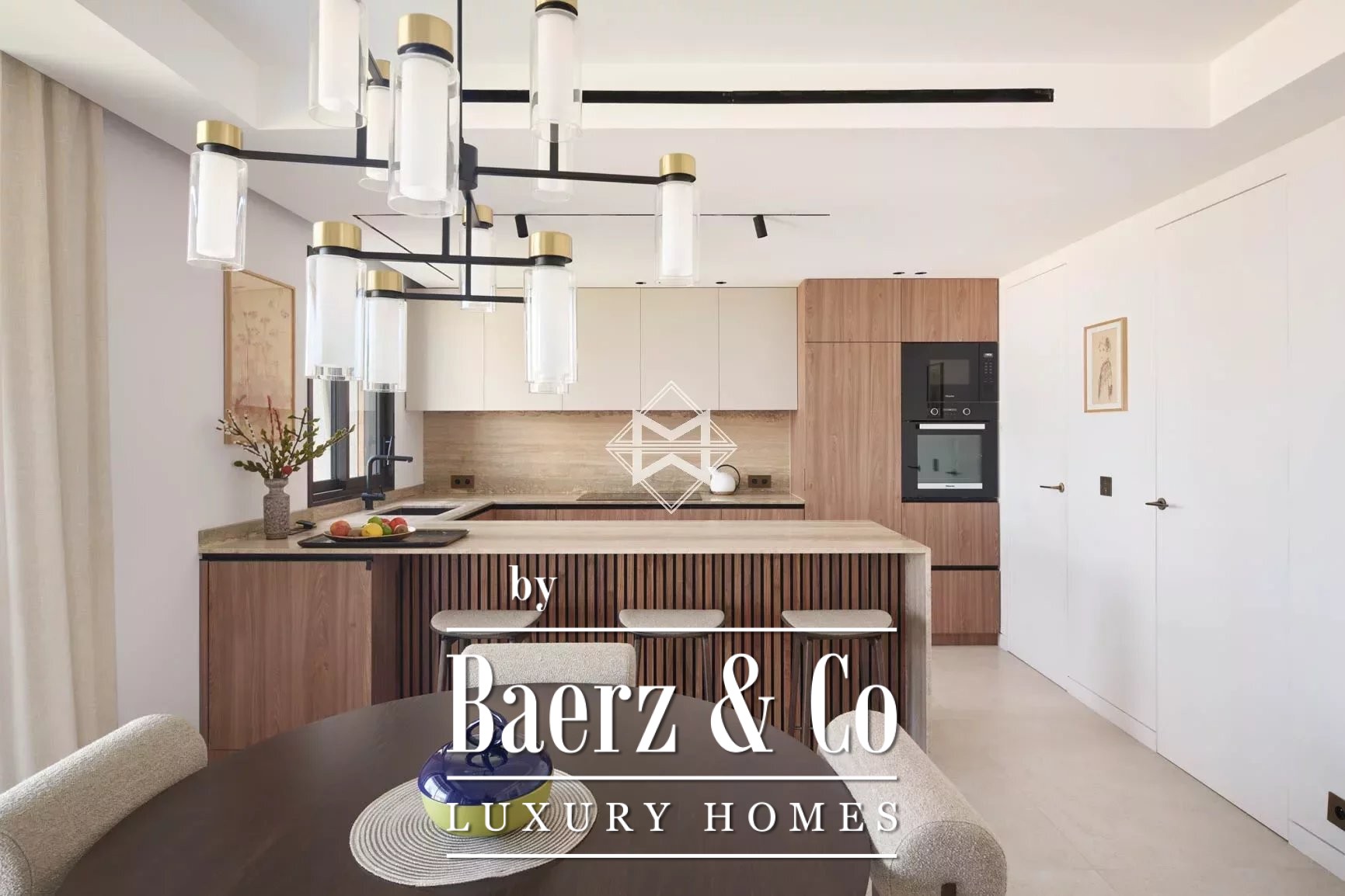 Binnen zorgen twee slaapkamers met en-suite badkamers voor privacy en comfort, waaronder een master suite met dubbele doucheruimtes en dubbele inloopkasten. Het centrale woongedeelte wordt bepaald door een keuken met een opvallend travertin werkblad en loopt naadloos over in het terras, waardoor het mediterrane licht optimaal wordt benut. Hoogwaardige details zijn onder meer airconditioning, geavanceerde domotica, videobewaking en een privégarage.