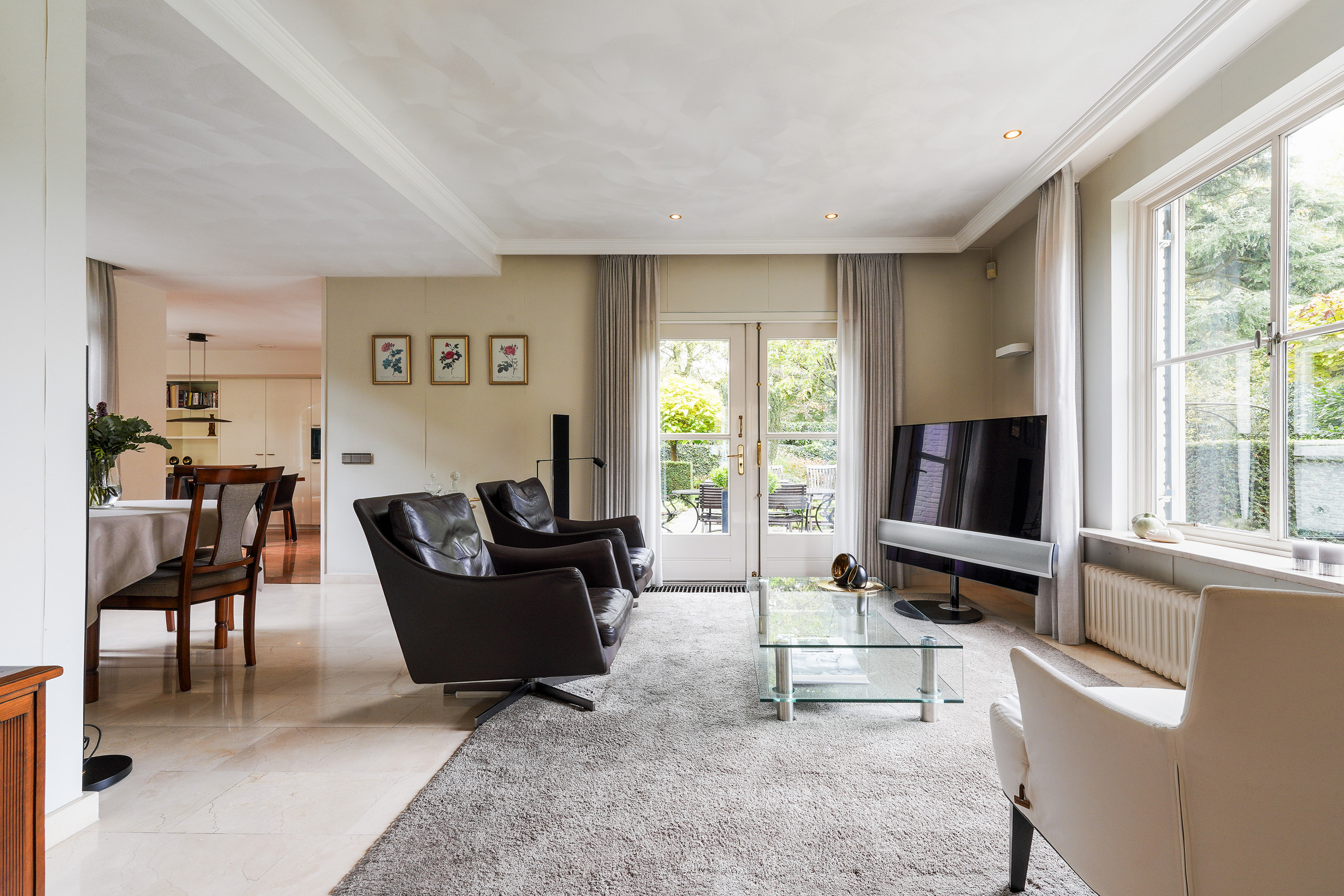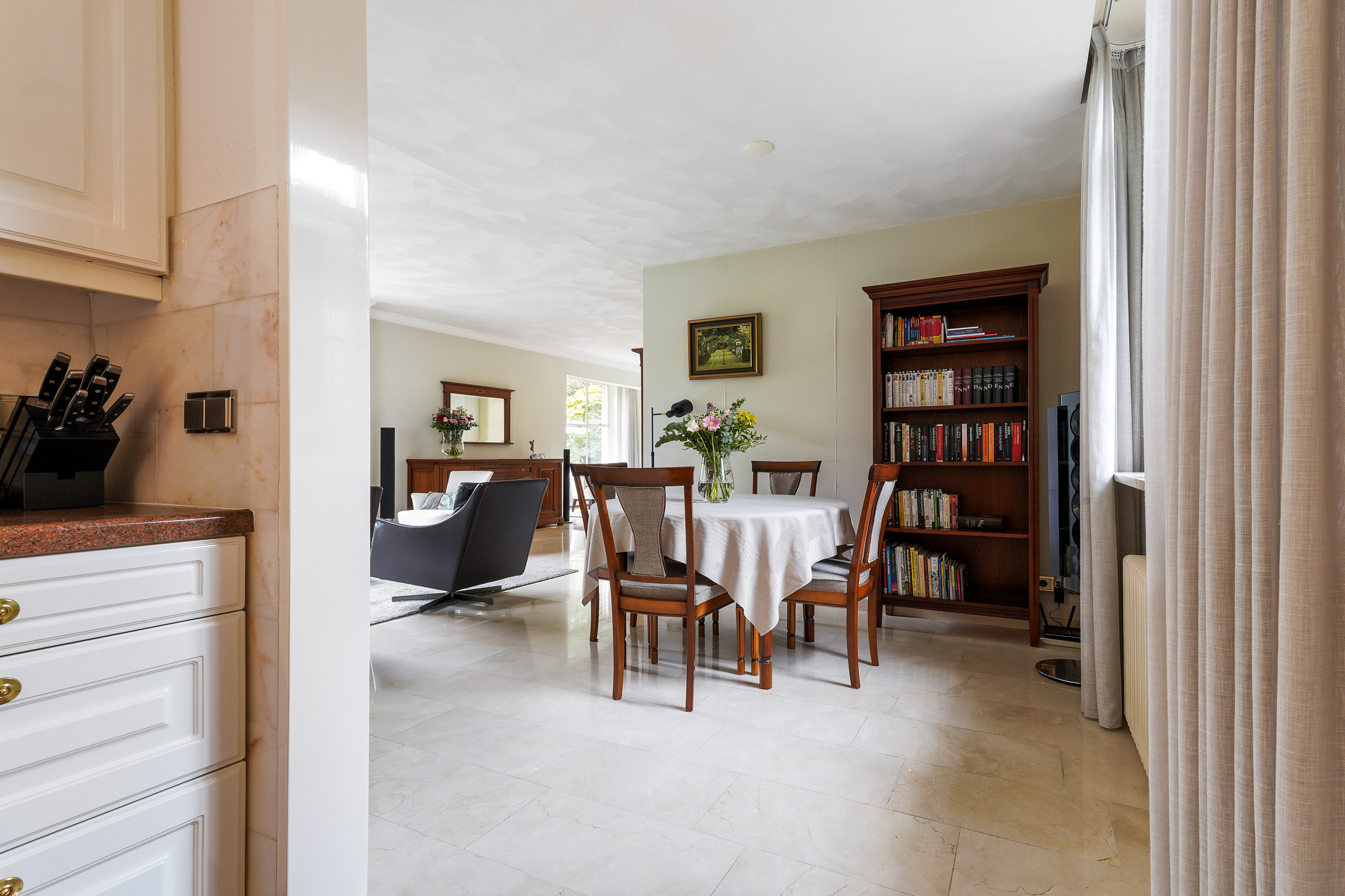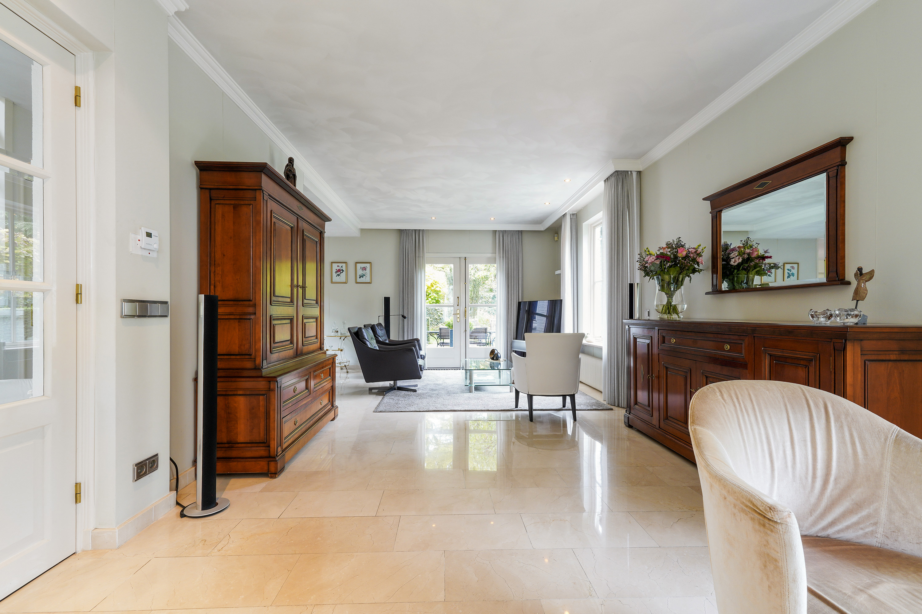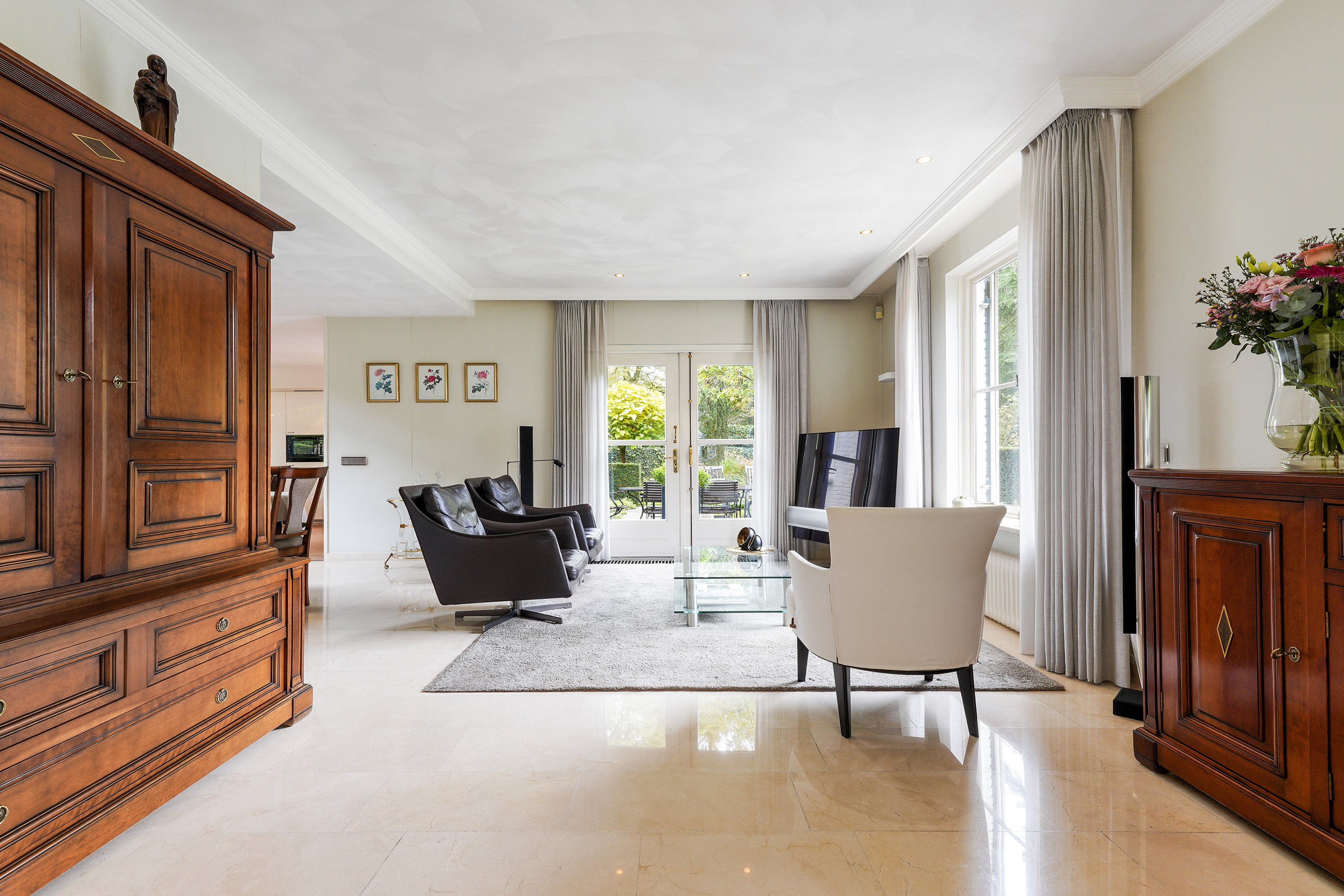 De begane grond ademt ruimte en elegantie. De royale living van circa 70 m² is opgedeeld in een zitkamer, eetkamer en woonkeuken, allen met elkaar in open verbinding, maar ieder met een eigen sfeer. Grote raampartijen zorgen voor een overvloed aan daglicht en een prachtig uitzicht op de groene omgeving. De travertinvloer, lichte wanden en plafonds creëren een rustige en stijlvolle basis.