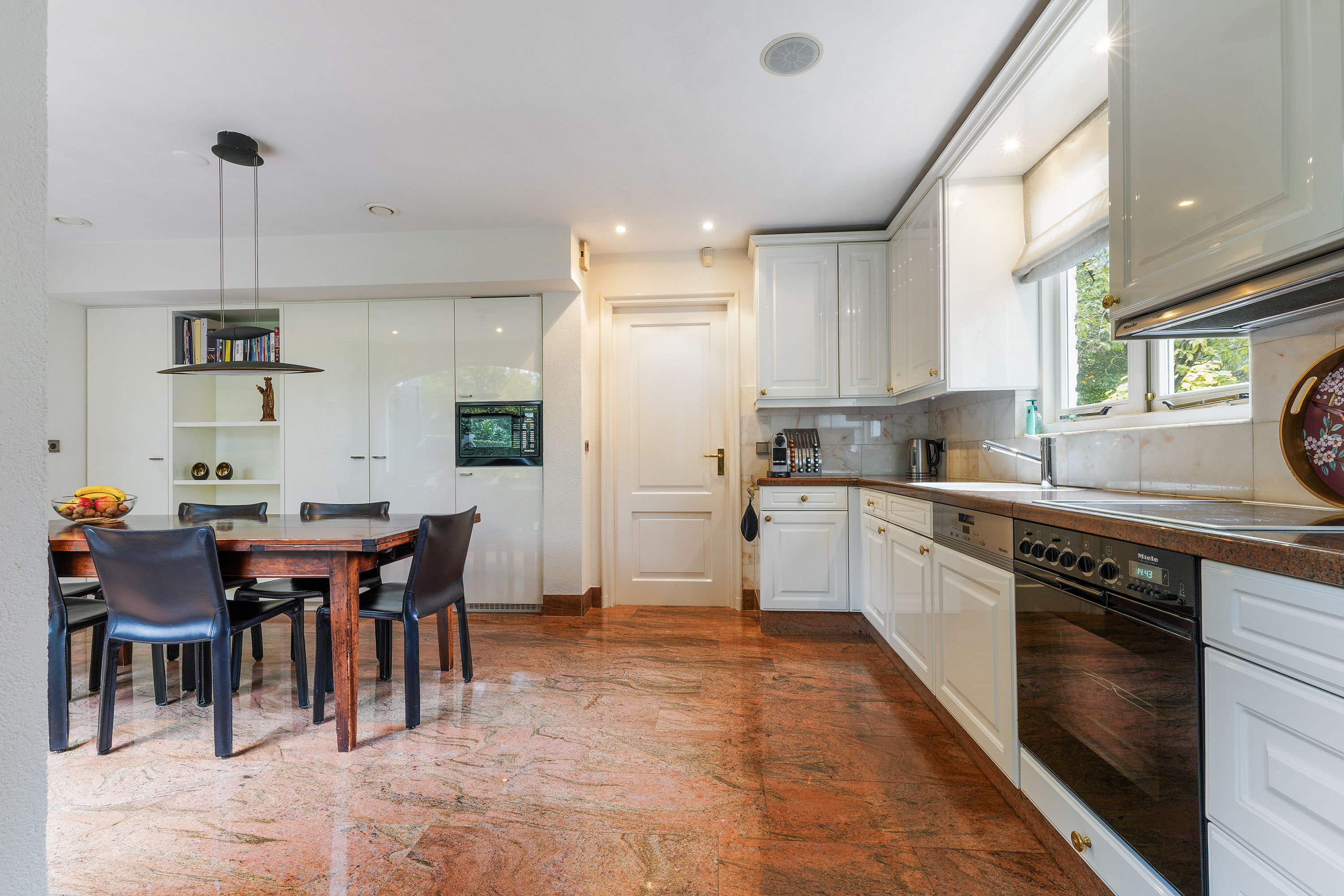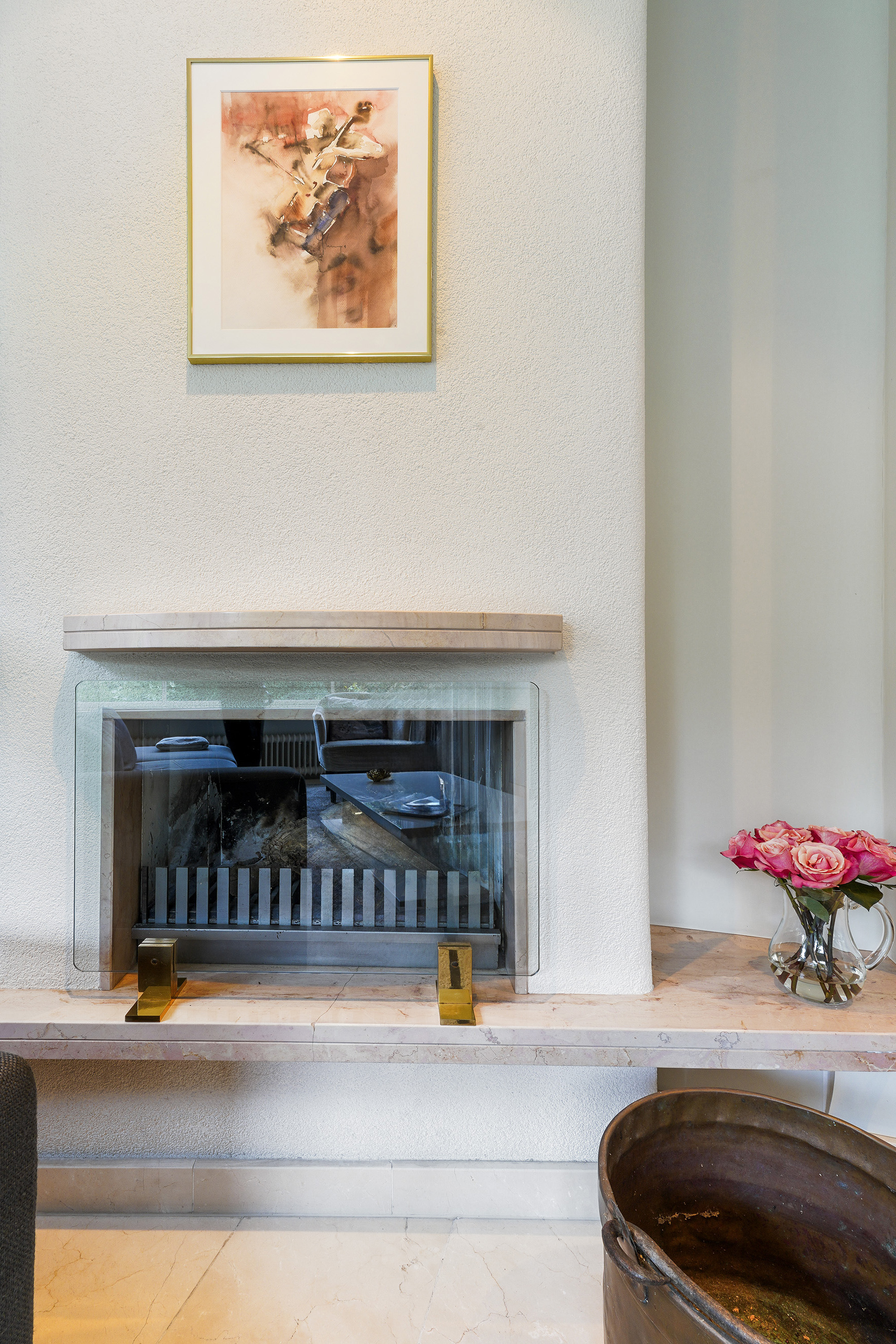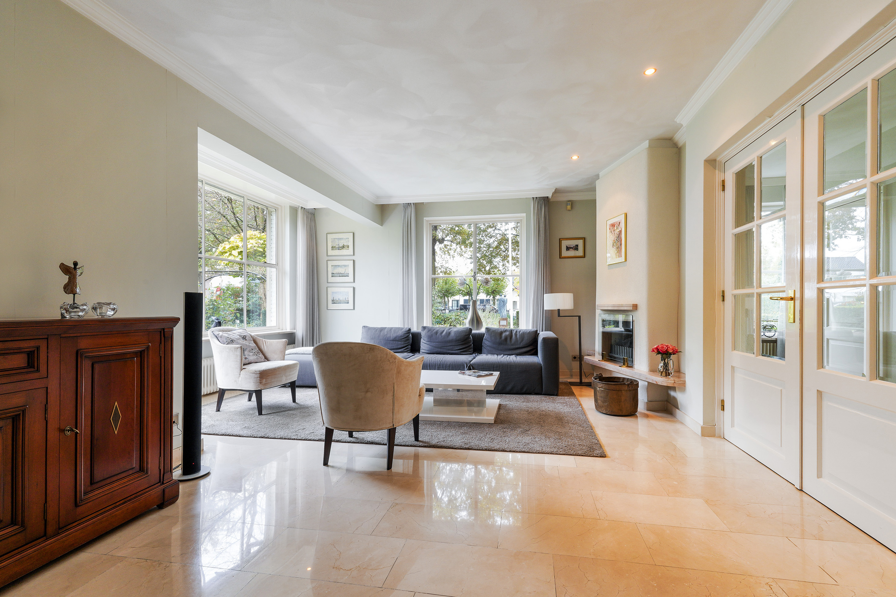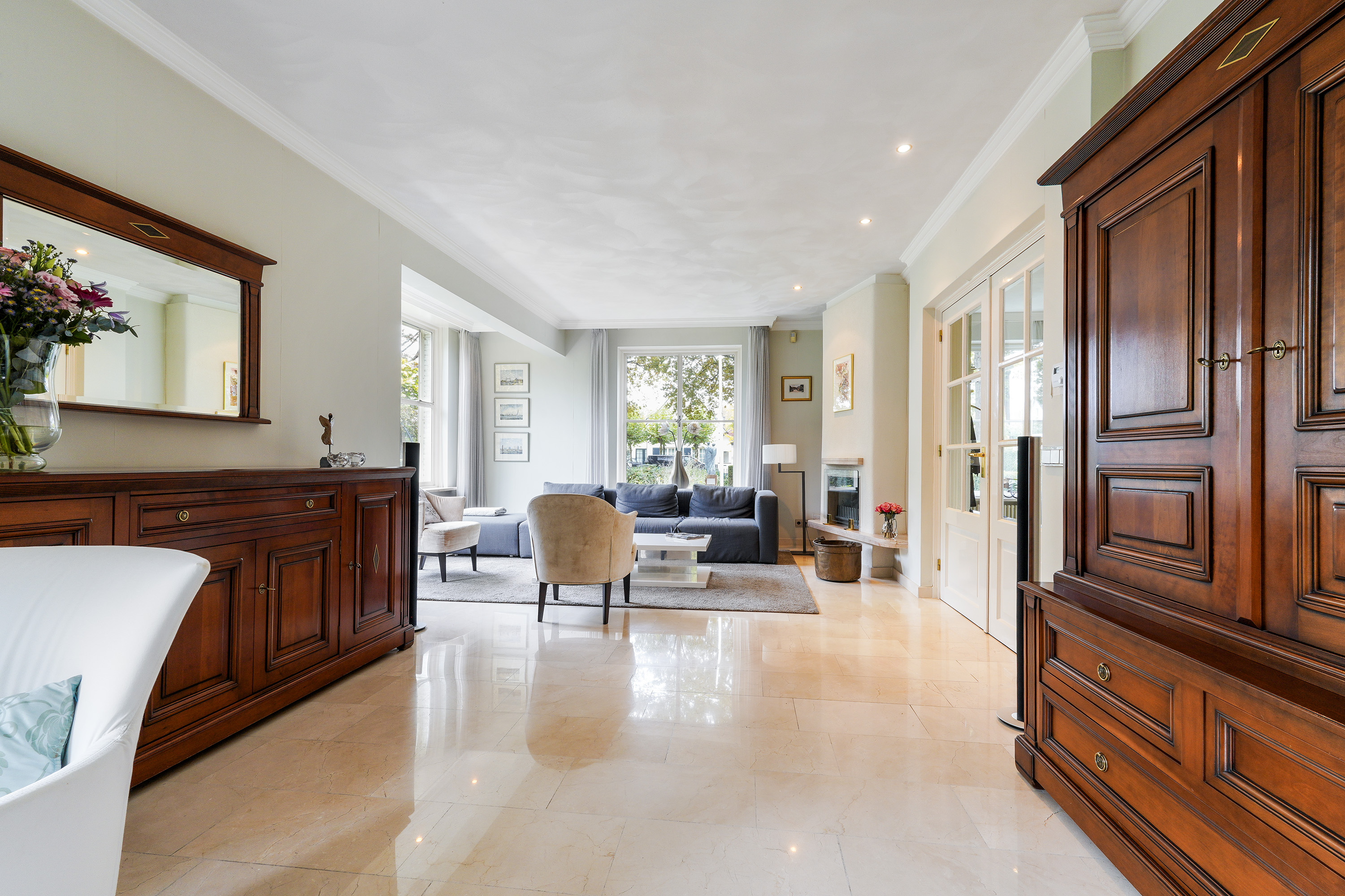 De begane grond ademt ruimte en elegantie. De royale living van circa 70 m² is opgedeeld in een zitkamer, eetkamer en woonkeuken, allen met elkaar in open verbinding, maar ieder met een eigen sfeer. Grote raampartijen zorgen voor een overvloed aan daglicht en een prachtig uitzicht op de groene omgeving. De travertinvloer, lichte wanden en plafonds creëren een rustige en stijlvolle basis.