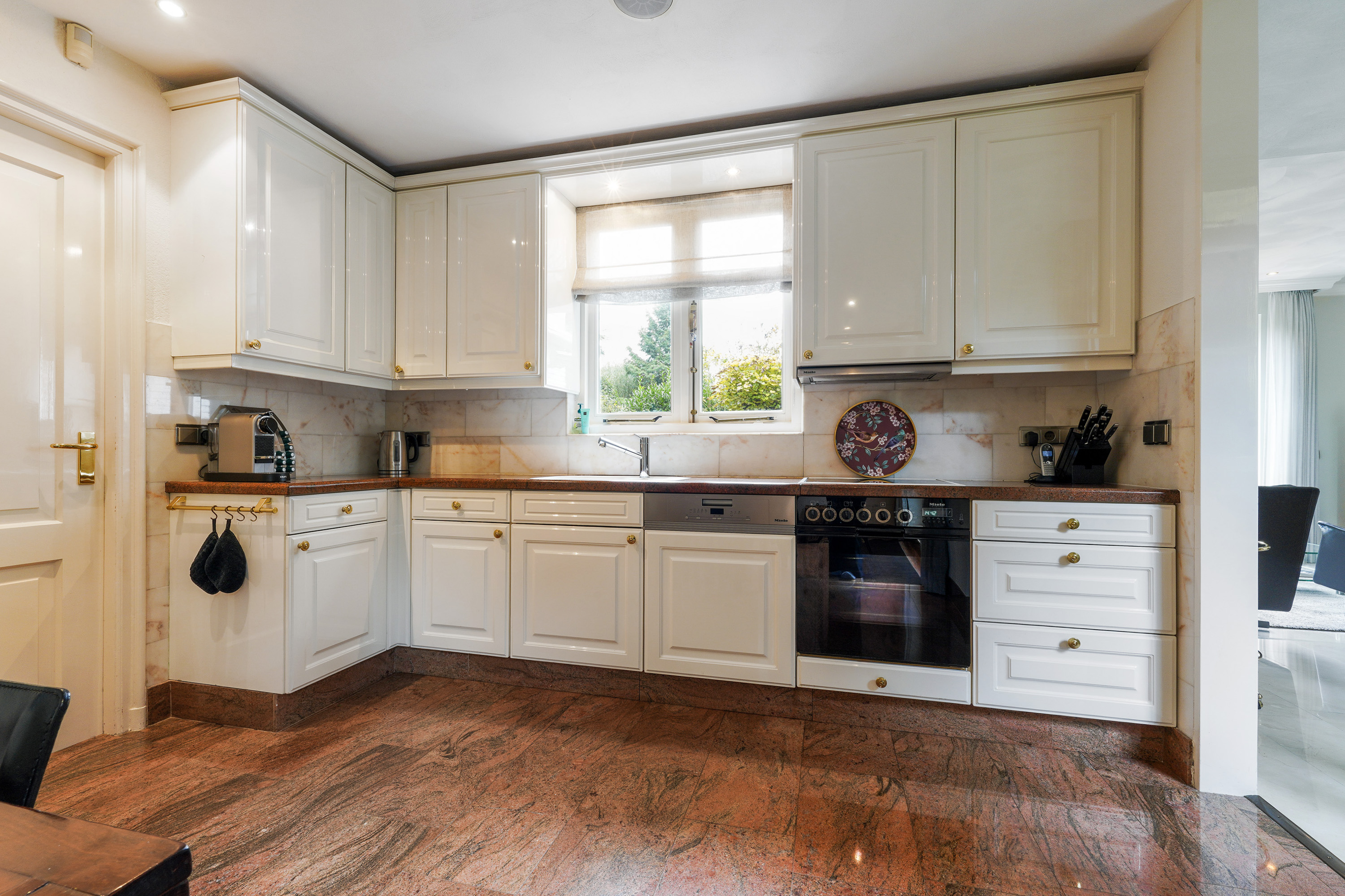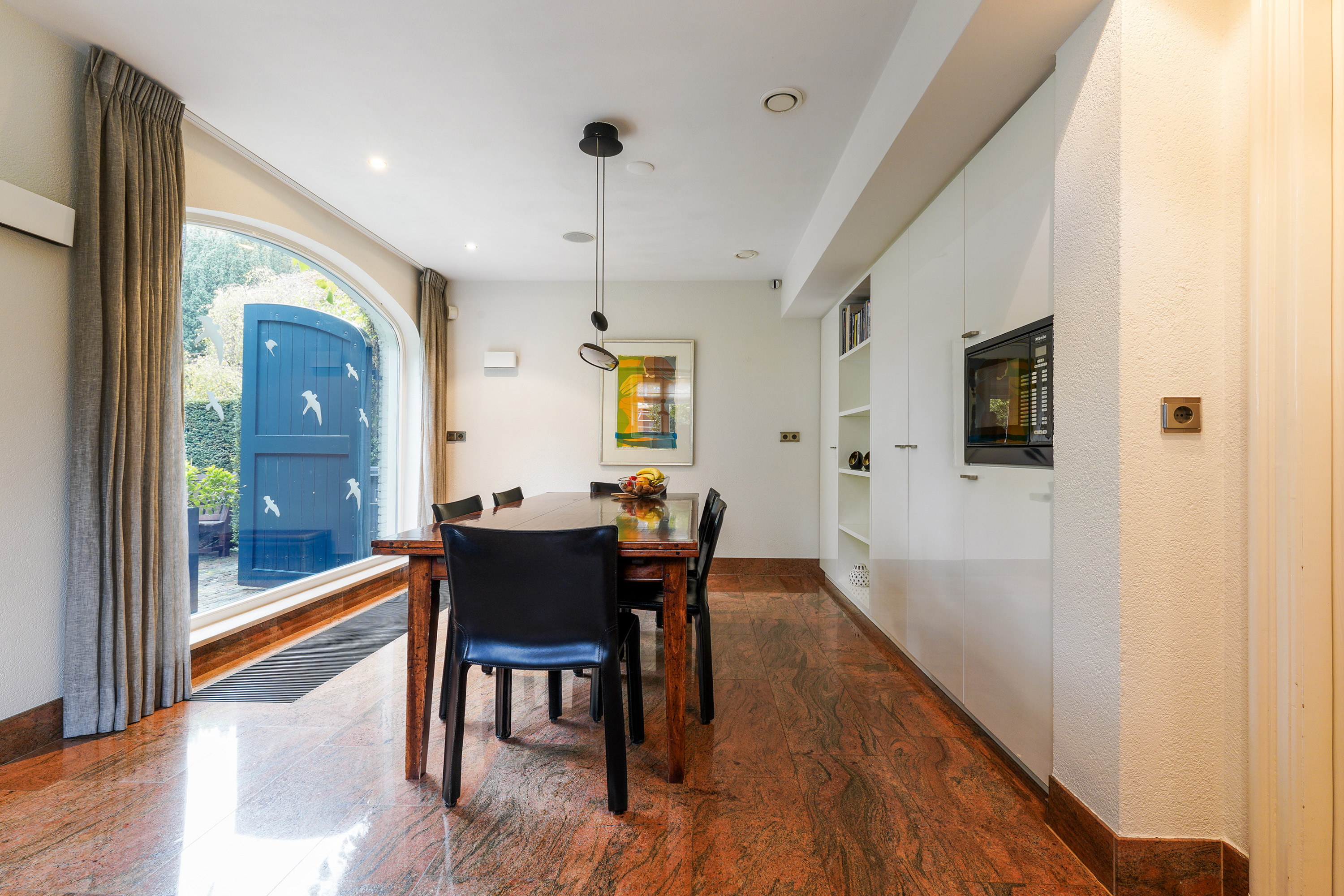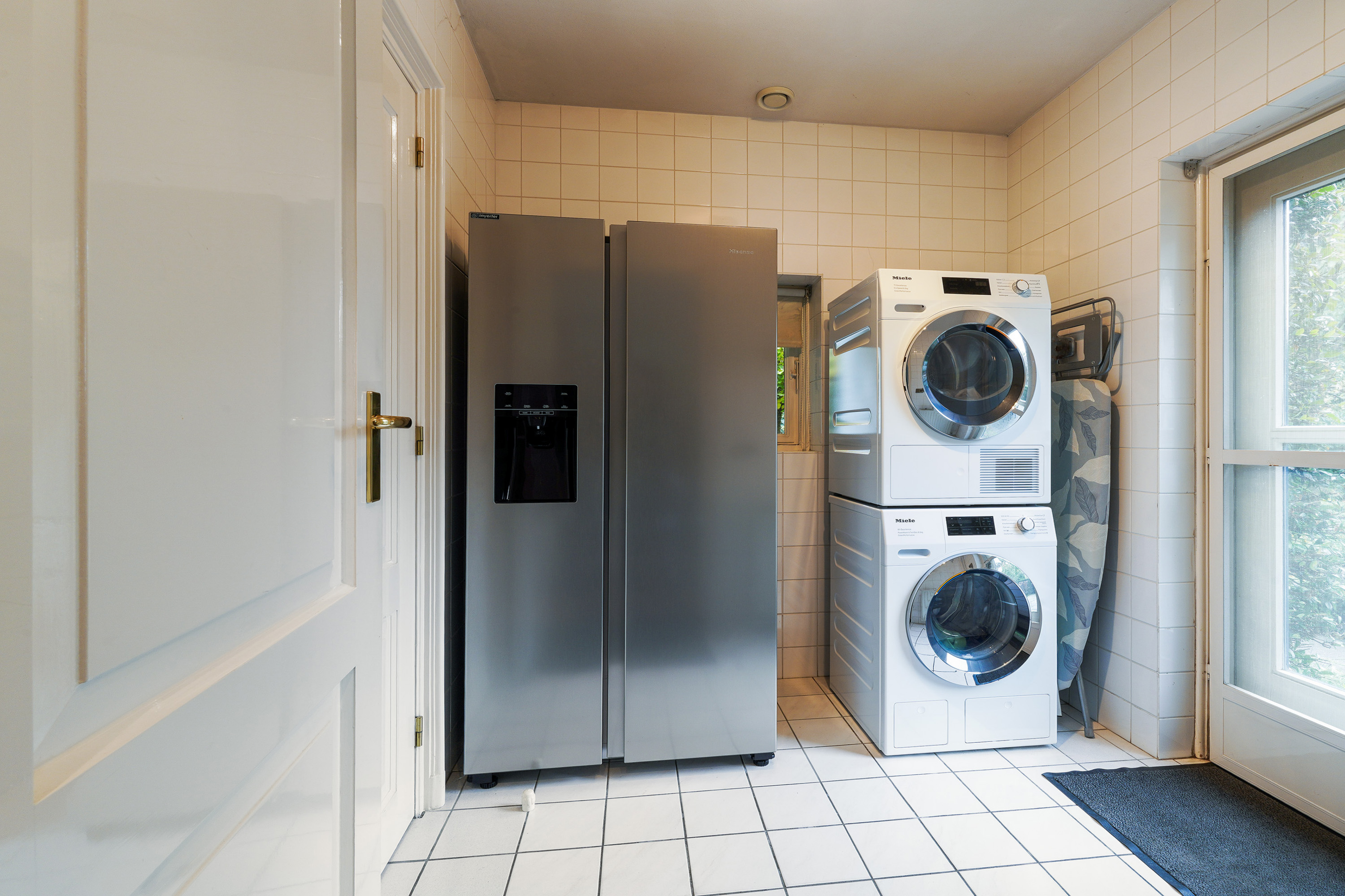De woonkeuken is een heerlijke plek voor wie graag kookt en samenkomt. De vaste kastenwand met diverse inbouwapparatuur en het grote werkblad met natuurstenen blad bieden volop werk- en bergruimte. Aansluitend vindt u de praktische bijkeuken met aansluiting voor wasmachine en droger, én toegang tot een inpandige berging van maar liefst 17 m² voorzien van vaste kasten en een spoelgedeelte. Deze ruimte beschikt bovendien over een vliering, ideaal voor extra opslag. Vanuit de hal op de begane grond is bovendien een kelder bereikbaar, een fijne extra voor voorraad of wijnopslag.