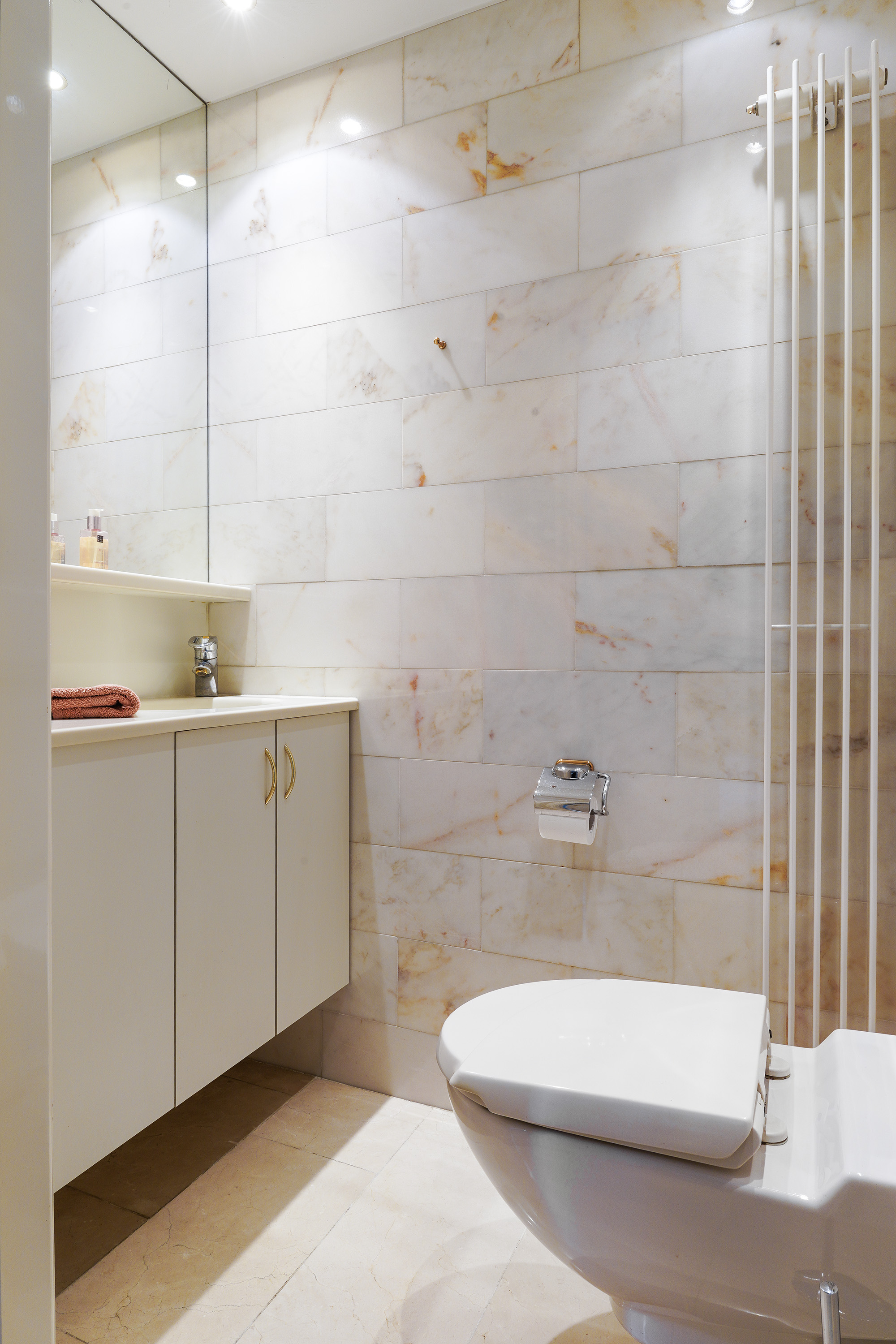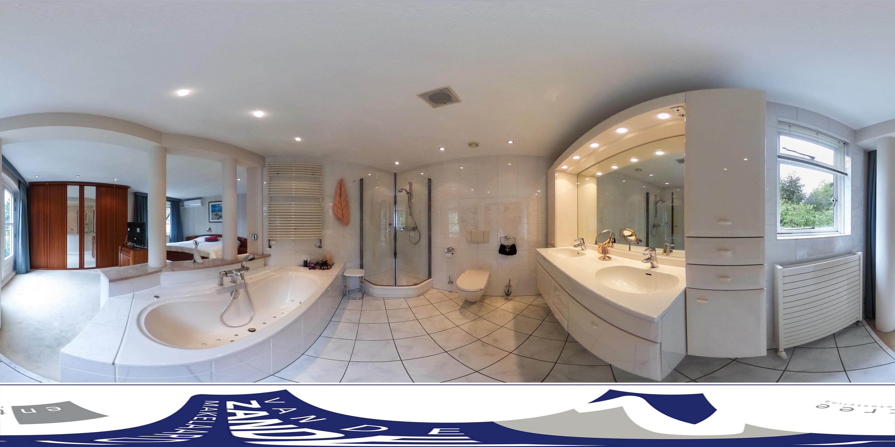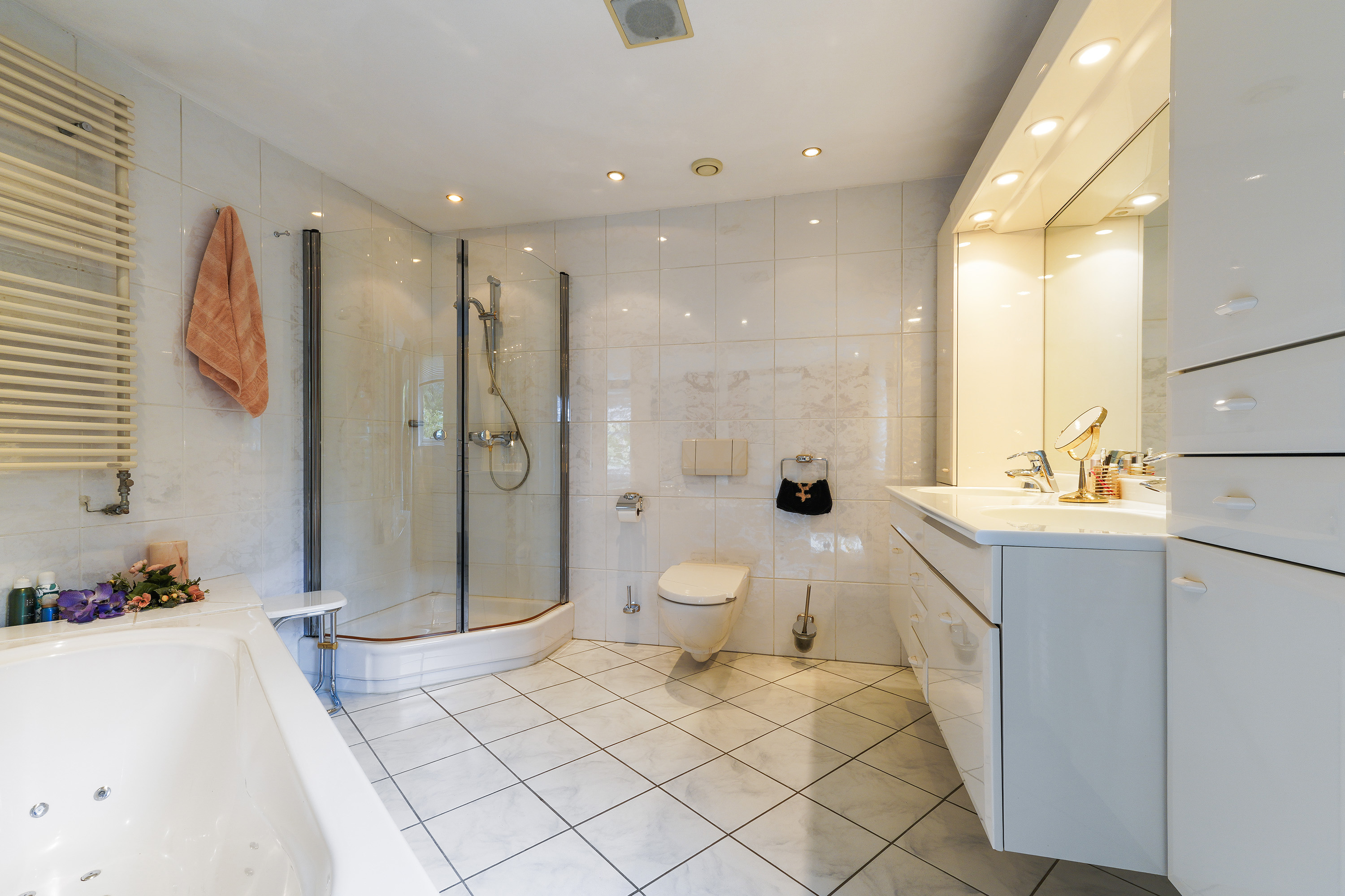 Op de eerste verdieping bevinden zich twee riante slaapkamers. De slaapkamer aan de achterzijde is een ware master suite met airco, vaste kastenwand, balkon met uitzicht op de achtertuin en directe open toegang tot de luxe badkamer met ligbad, douche, toilet en dubbele wastafel met meubel. De tweede slaapkamer, gelegen aan de voorzijde, beschikt over praktische vaste kasten onder de kapschuinte. Daarnaast is er op deze verdieping een tweede badkamer met douche en wastafel, en een separaat toilet op de overloop.