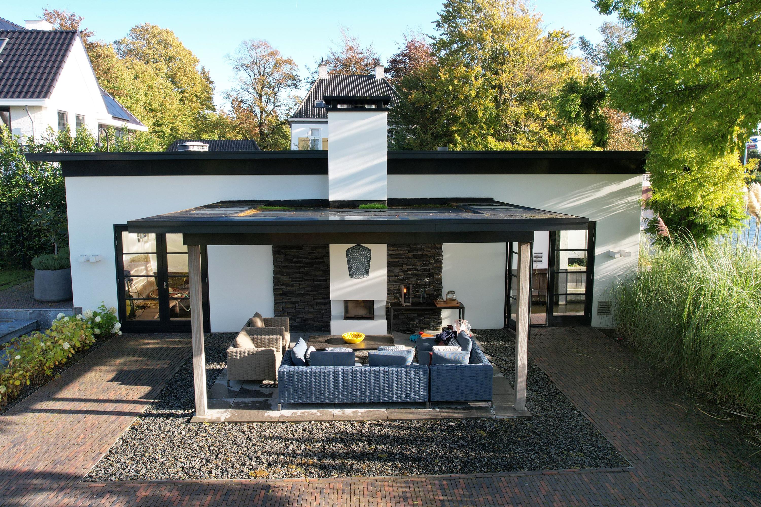 Hoge raampartijen en openslaande deuren zorgen voor een naadloze overgang tussen binnen en buiten.