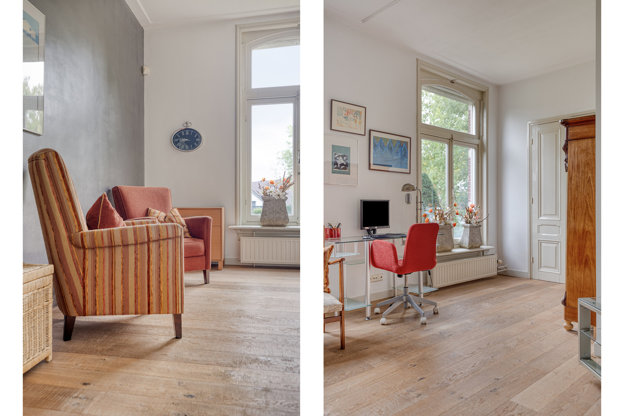 werkkamer (ca. 18 m²) met een schouwpartij, wandafwerking stucwerk, parketvloer, authentiek plafond;