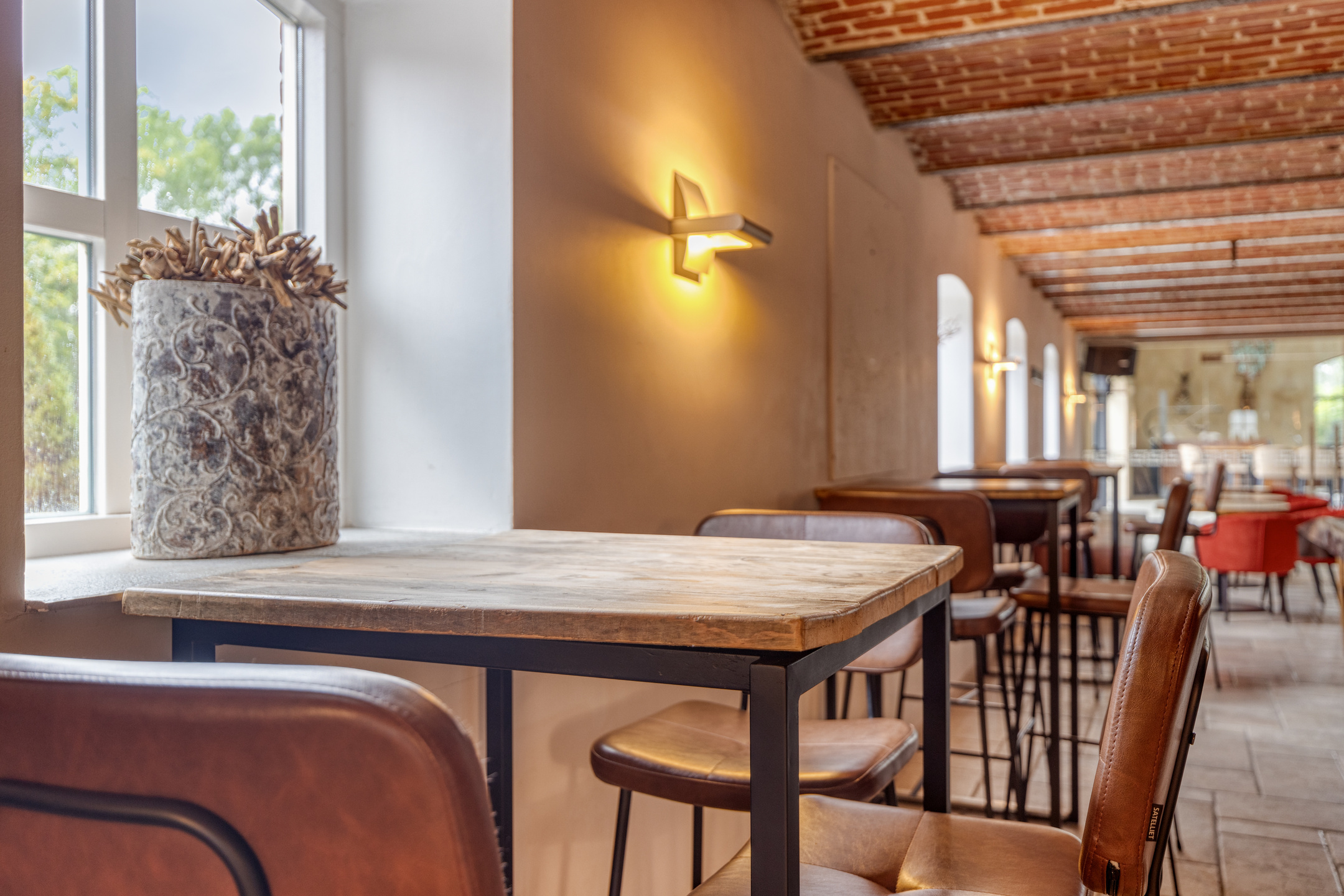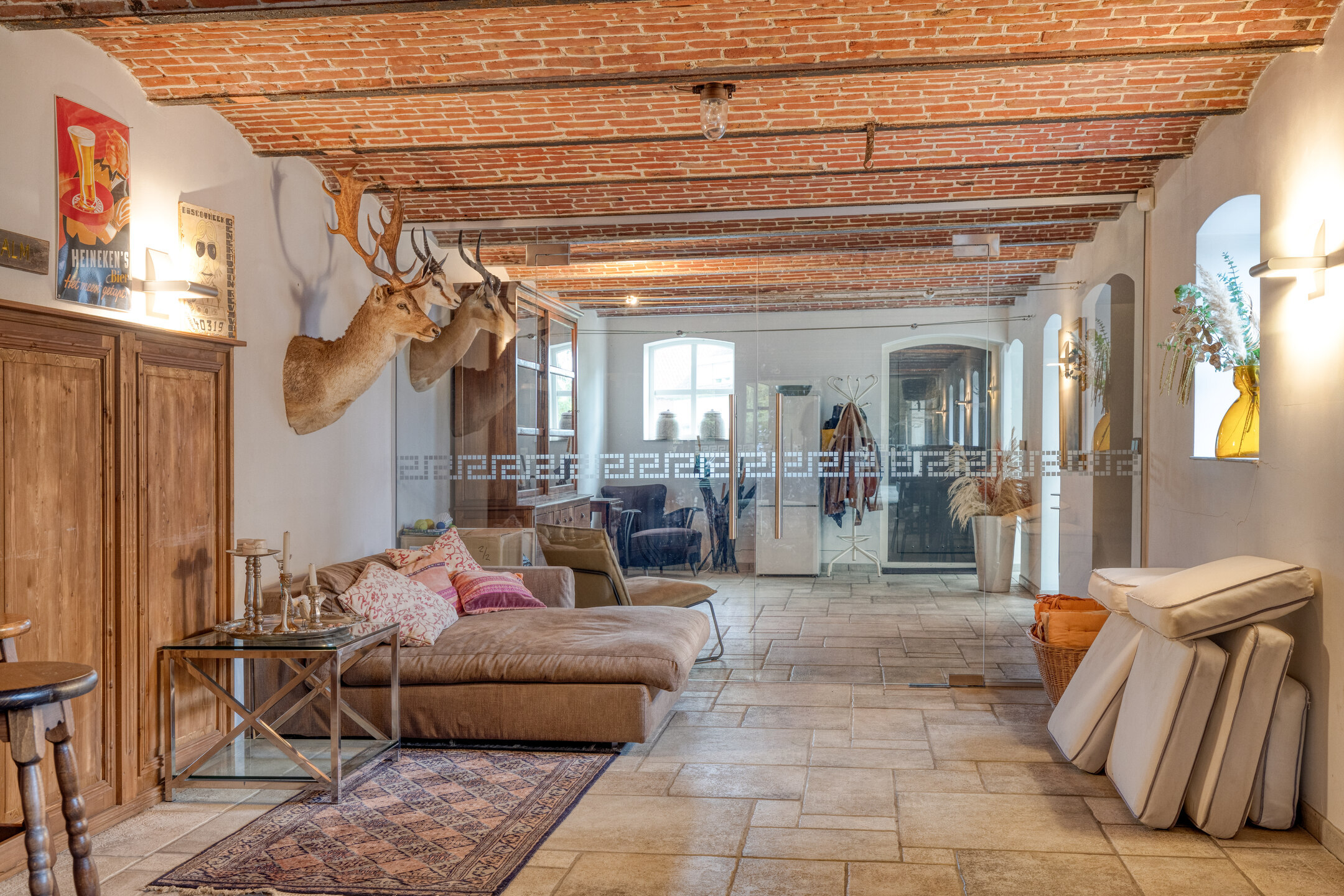 ontspanningsruimte met een complete barinrichting, wandafwerking stucwerk, tegelvloer, gewelvenplafond;