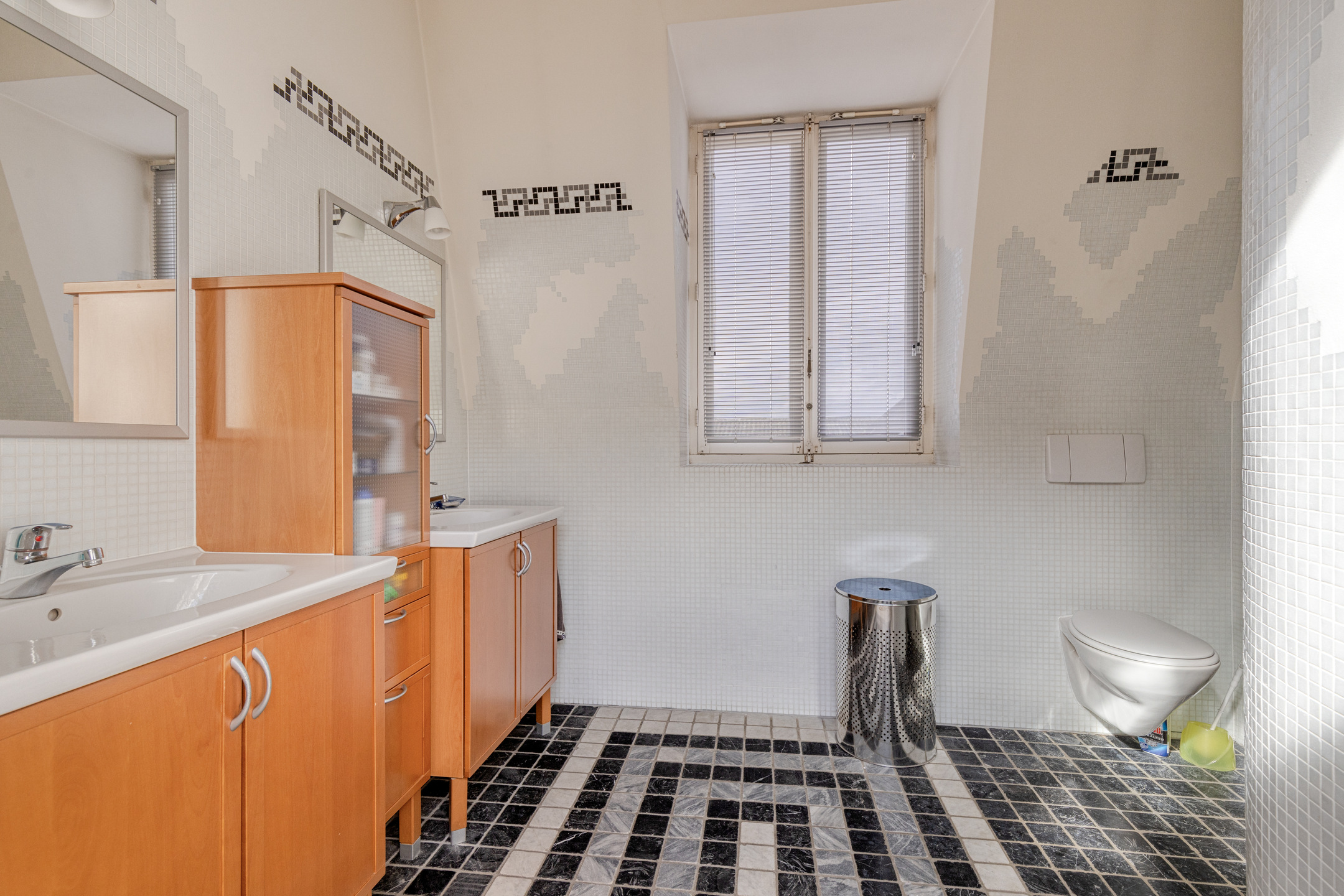 betegelde badkamer, voorzien van een badkamermeubel met dubbele wastafel, wandcloset, inloopdouche en designradiator.