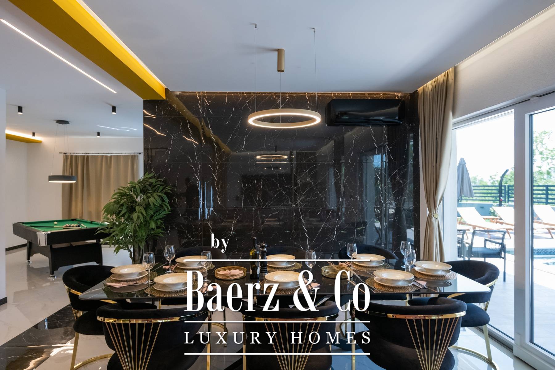 De begane grond opent met een riante woonkamer, een pooltafel en een keuken die overloopt in een open eetgedeelte. Iedere overgang leidt het oog naar een brede terras en een verwarmd zwembad van 56 m², waarmee het buitenleven als vanzelf in het hart van het huis wordt geïntegreerd. Een speciale wellnessruimte met fitness, sauna, jacuzzi en douche vormt het rustpunt voor een dagelijks gevoel van herstel.